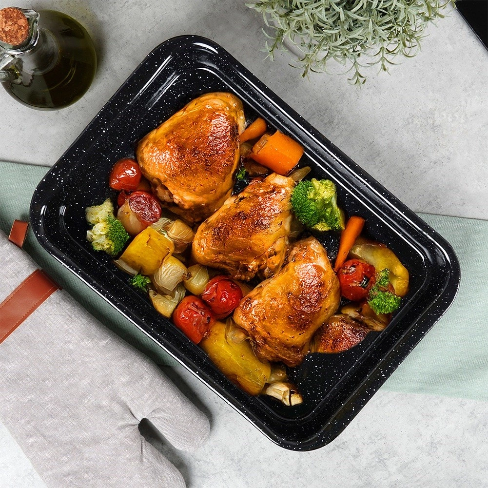 Praktický obdĺžnikový pekáč z kvalitnej smaltovanej ocele s objemom 3 l a rozmermi 35,5 × 24 × 5 cm je ideálny na pečenie mäsa, zeleniny, koláčov aj domácej pizze. Odolný smalt je zdravotne nezávadný a vhodný aj pre alergikov, potraviny sa nepripékajú a ľahko sa čistí – vrátane umývačky. Vhodné do plynových aj elektrických rúr.