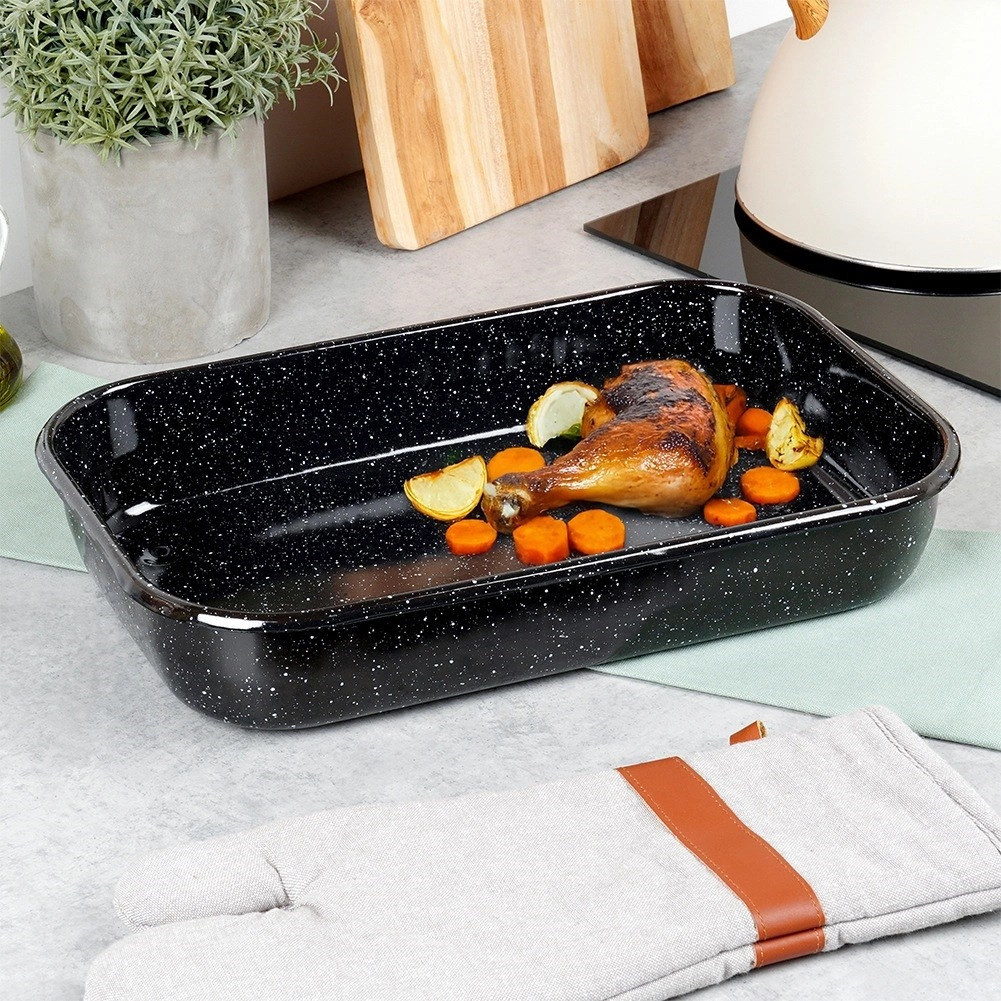 Obdĺžnikový pekáč zo smaltovanej ocele je odolný, hygienický a výborne vedie teplo pre rovnomerné prepečenie pokrmov. Smalt je šetrný k zdraviu a vhodný aj pre alergikov. Vďaka univerzálnym rozmerom 38 × 24,5 × 7 cm (vnútorne 36 × 22,5 × 6 cm) sa hodí na pečenie mäsa, zeleniny, nákypov aj dezertov.
