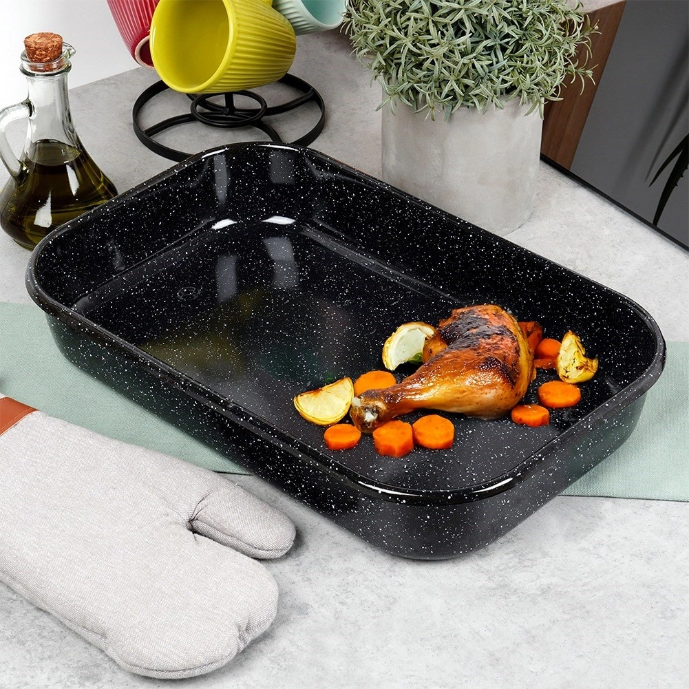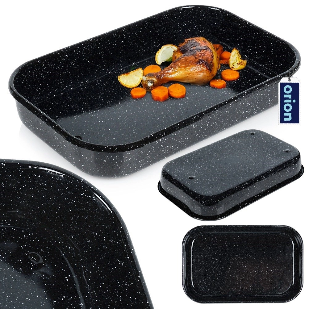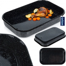 Praktický obdĺžnikový pekáč s objemom 6 litrov z kvalitnej smaltovanej ocele v elegantnej čiernej farbe. Ideálny na pečenie mäsa, zeleniny aj koláčov, vhodný do plynových aj elektrických rúr. Jednoduché čistenie vďaka hladkému smaltu, možnosť umývania v umývačke. Tradičná kvalita značky ORION.