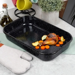 Robustný smaltovaný pekáč s rozmermi 42 × 27 × 7 cm (vnútorné 39 × 25 × 7 cm) je skvelou voľbou na každodenné varenie a pečenie. Smaltovaný povrch je hygienický, odolný a vhodný aj pre alergikov. Vysoké okraje zabezpečia rovnomerné pečenie a dostatok miesta pre šťavy a prílohy.