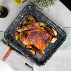 Vysoké okraje a rovnomerná tepelná vodivosť sú skvelé pre šťavnaté pečienky, zemiaky či zapekané jedlá.