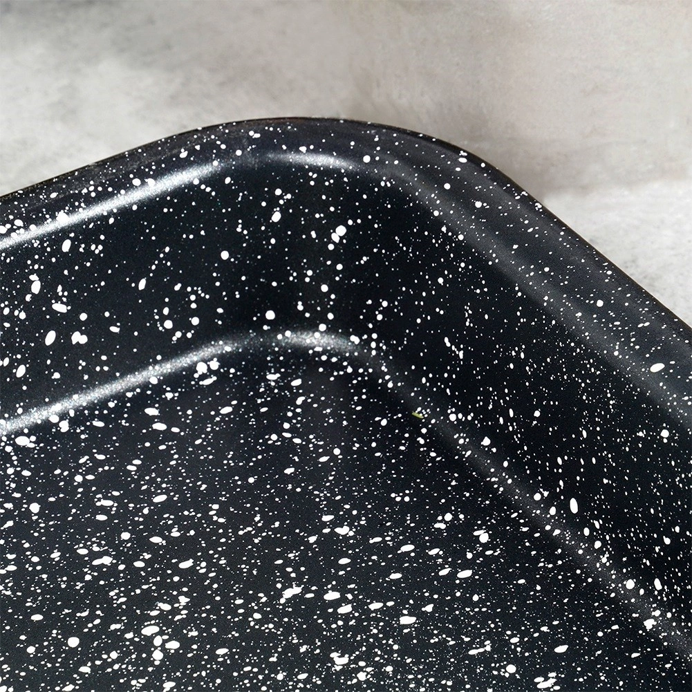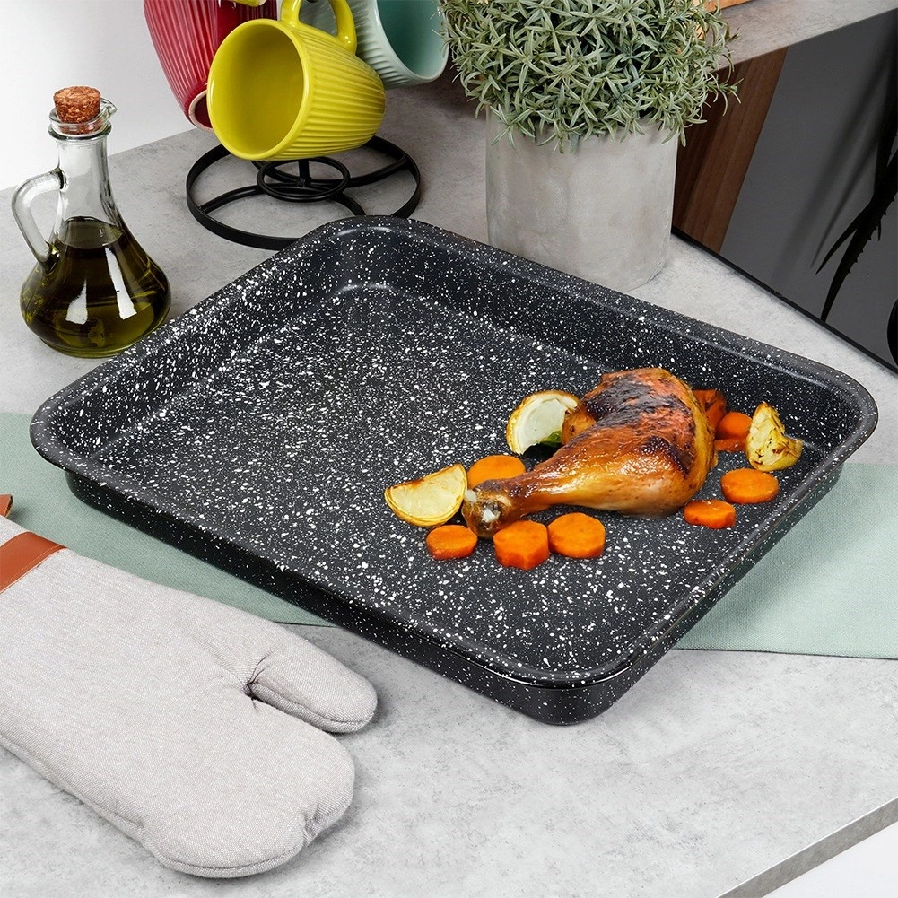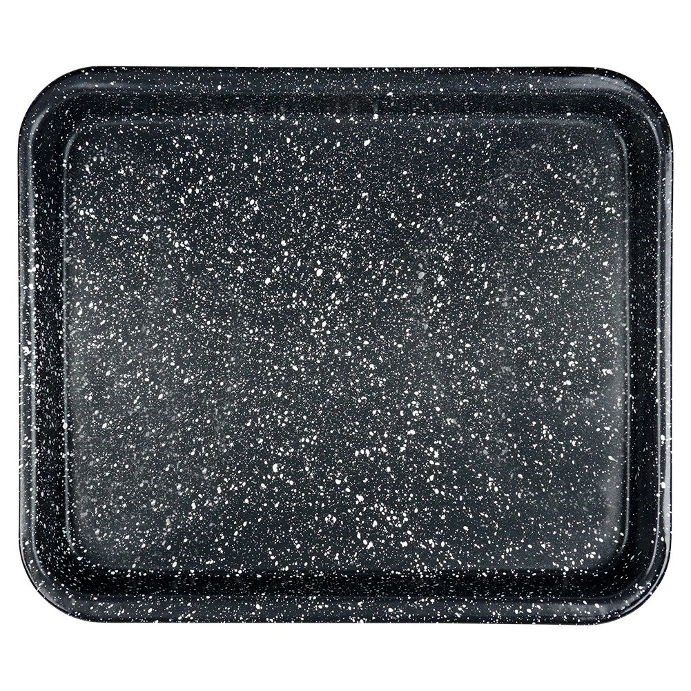 Univerzálny pekáč s vysokými okrajmi vám zaistí rovnomerné prepečenie a pohodlnú manipuláciu. Vnútorná granitová nepriľnavá vrstva minimalizuje pripáľanie aj pri použití malého množstva tuku a je odolná proti poškrabaniu. Smaltovaný kov v elegantnej čiernej farbe je odolný a dlhodobo drží tvar.