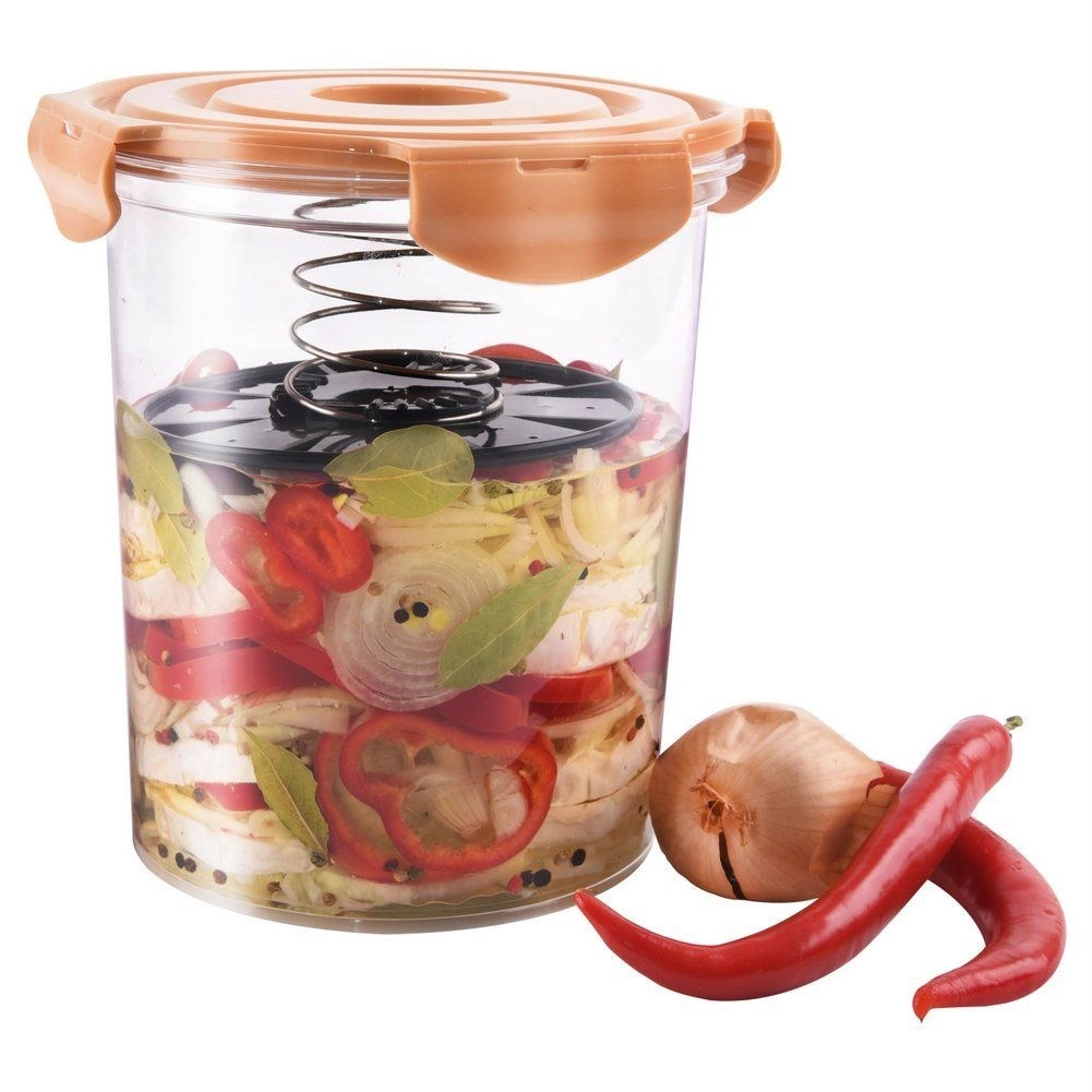 Praktická nádoba na marinovanie a kvasenie s objemom 4 l s priehľadným telom a pružinovým prítlakom udrží suroviny pevne ponorené v náleve. Vďaka veku so štyrmi klipmi a silikónovým tesnením je vzduchotesná, takže lepšie vstrebáva marinádu, šetrí olej aj nálev a predlžuje čerstvosť potravín.