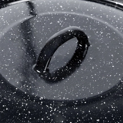 Oceľové telo so smaltom je odolné voči poškrabaniu a korózii, zatiaľ čo robustný úchyt zabezpečuje bezpečné dvíhanie aj pri vyšších teplotách. Smalty môžu prirodzene vykazovať drobné výrobné nerovnosti (vydutiny, nesúmerný postrek a pod.), ktoré neovplyvňujú kvalitu ani funkciu.