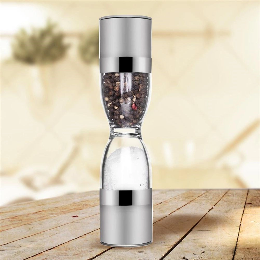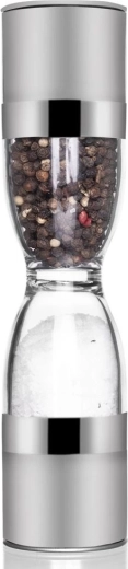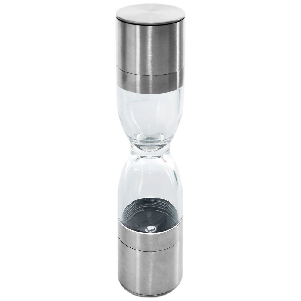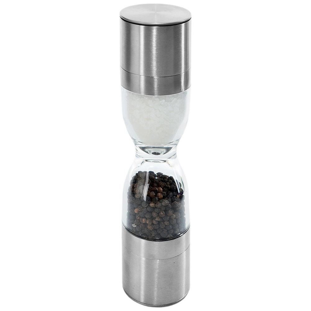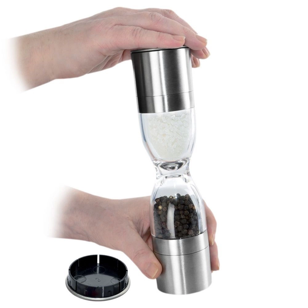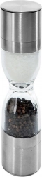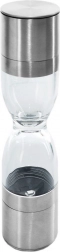 Elegantný dvojitý mlynček na korenie v tvare presýpacích hodín kombinuje nehrdzavejúcu oceľ, priehľadné zásobníky a keramické mlecí mechanizmy na presné mletie soli aj korenia. Ponúka nastaviteľnú hrubosť mletia, dve samostatné komory a ochranné krytky proti vysypávaniu zvyškov. Skvelý pomocník do každej kuchyne aj štýlový doplnok stola.