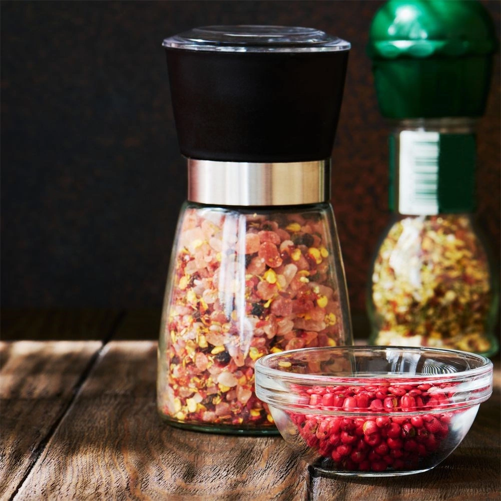 Univerzálny sklenený mlynček na soľ, korenie aj ďalšie koreniny s výškou 13 cm a priemerom 6,5 cm. Ponúka ručné mletie, keramický mlecí mechanizmus pre tvrdé zrná, reguláciu hrubosti pomocou otočného gombíka a viečko proti vysypávaniu zvyškov. Elegantný, odolný a ľahko sa čistí – ideálny do kuchyne aj gastronomických prevádzok.