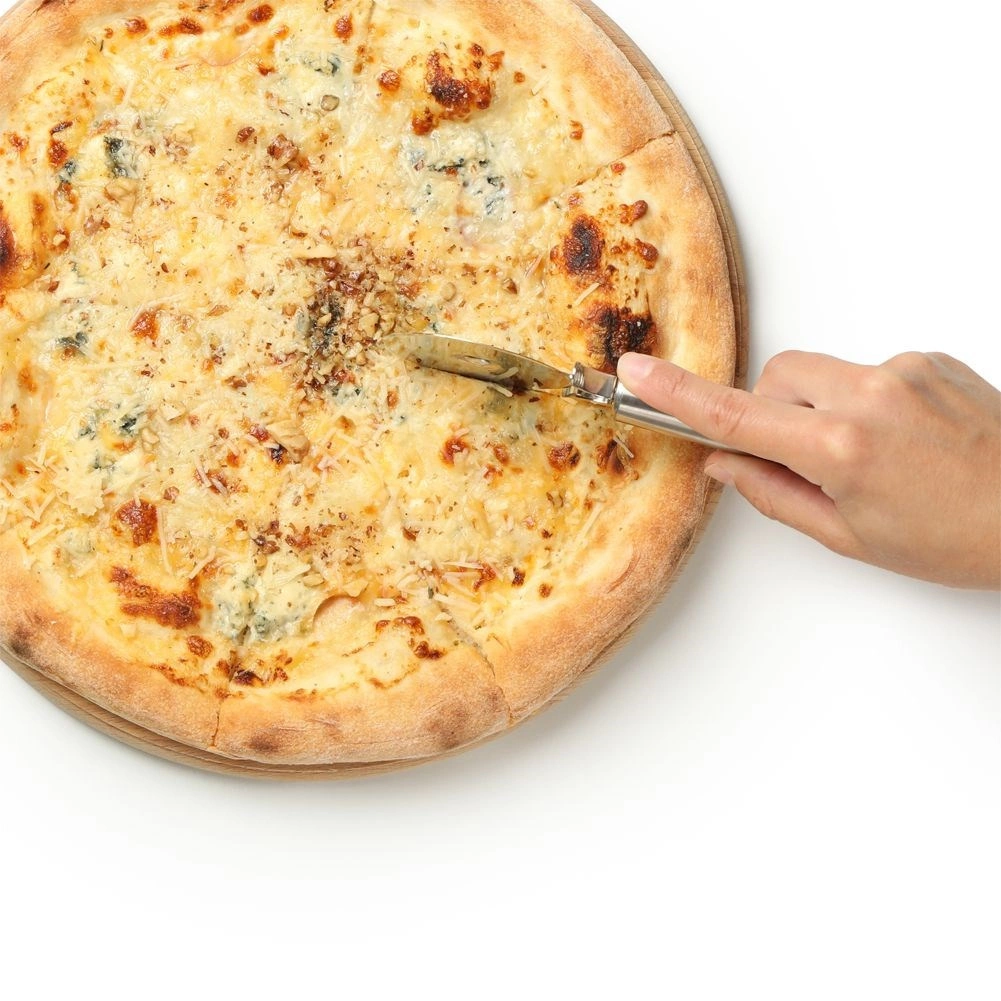Ľahko rozdelíte čerstvo upečenú pizzu na rovnaké diely priamo na servírovacej doštičke.