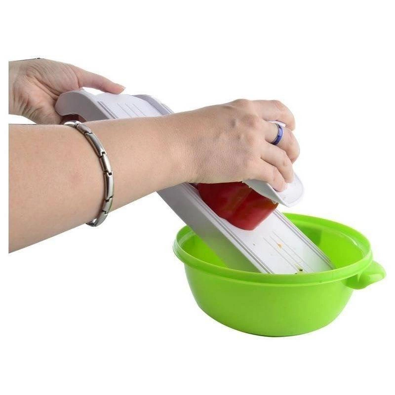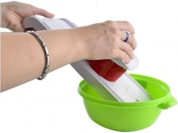 Praktický krájač na zeleninu a ovocie s rozmermi 36 × 12,5 × 4 cm ponúka vymeniteľné nadstavce na krájanie a strúhanie, ostrý nerezový nôž a bezpečnostný držiak pre pohodlnú a bezpečnú prácu. Vďaka pevnej konštrukcii, šikmému tvaru a zárezu na oprenie o okraj misy je krájanie rýchle, presné a bez námahy.