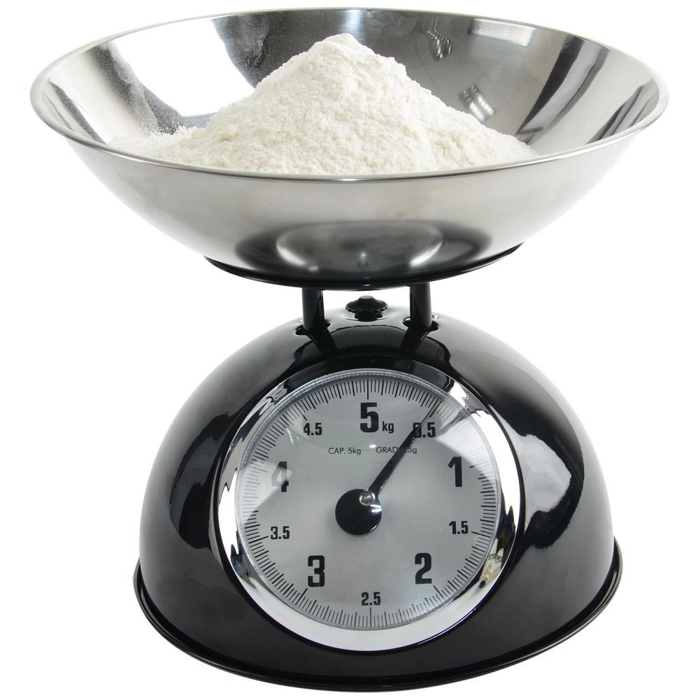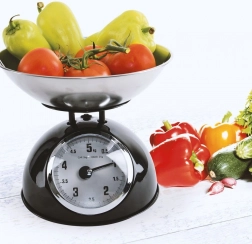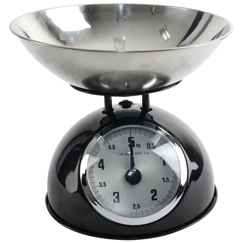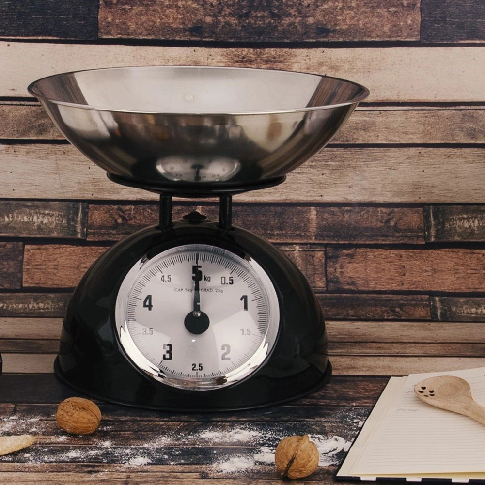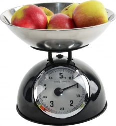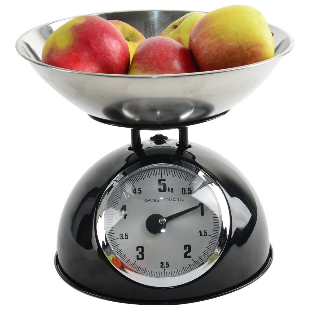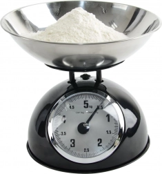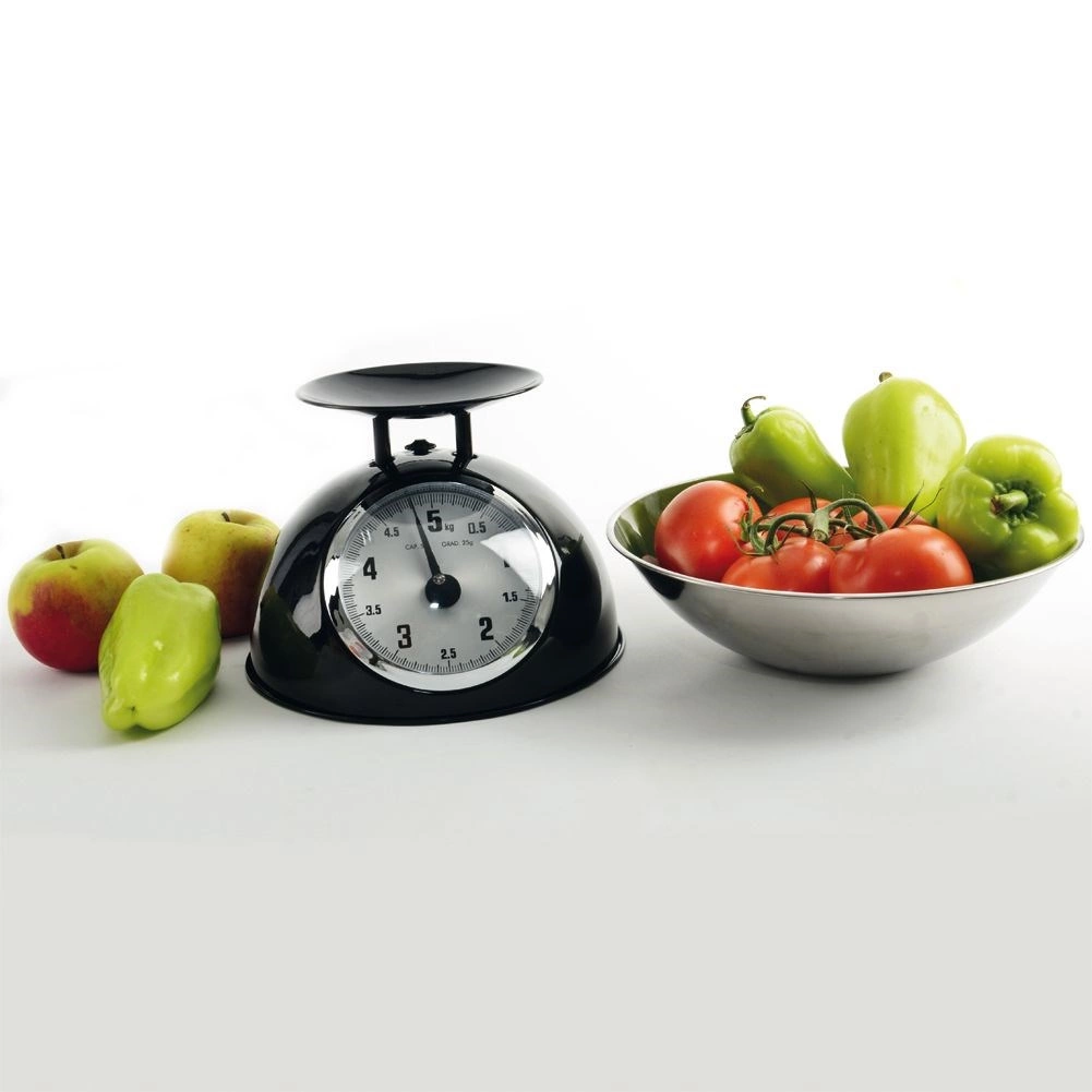 Táto mechanická váha v retro štýle je spoľahlivým pomocníkom do každej kuchyne. Robustné kovové telo v čiernej farbe a nerezová miska zabezpečujú dlhú životnosť aj jednoduchú údržbu. Vďaka analógovému ciferníku s jasným značením do 5 kg ľahko odvážite ovocie, zeleninu, sypké suroviny aj mäso.