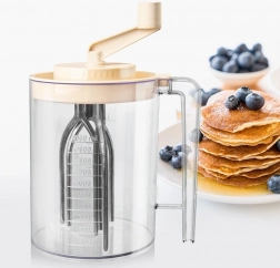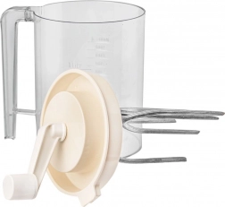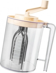 Praktický ručný mixér s kľukou a integrovanou odmerkou s objemom 1,5 l na jednoduché šľahanie, miešanie a prípravu cesta. Vďaka priehľadnej nádobe s presnou stupnicou v ml a litroch, pevnej rukoväti a viečku proti rozstreku pripravíte rýchlo a čisto šľahačku, sneh z bielkov, palacinkové cesto aj omáčky. Mechanický pohon bez elektriny, odolné materiály a ľahká údržba robia z mixéra spoľahlivého pomocníka do každej kuchyne.
