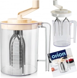 Ručný mixér ORION kombinuje šľahač, metličku a odmerku v jednom. Priehľadná nádoba so stupnicou (100–1000 ml a 1/4, 1/2, 3/4, 1 l) uľahčí presné dávkovanie surovín. Mechanická kľuka poháňa vnútorné metly, takže miešate efektívne, bez potreby elektriny a bez rozstreku vďaka uzavretému viečku.