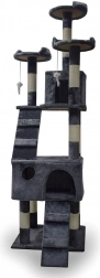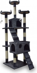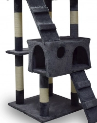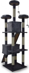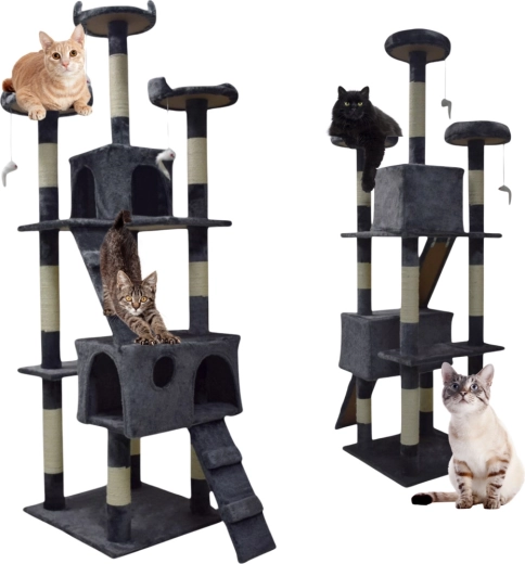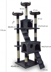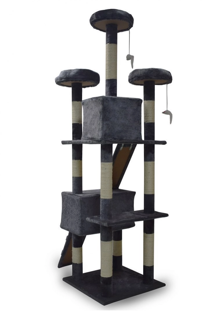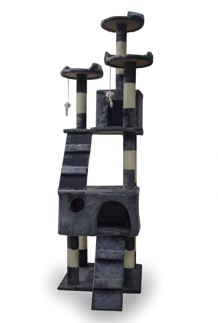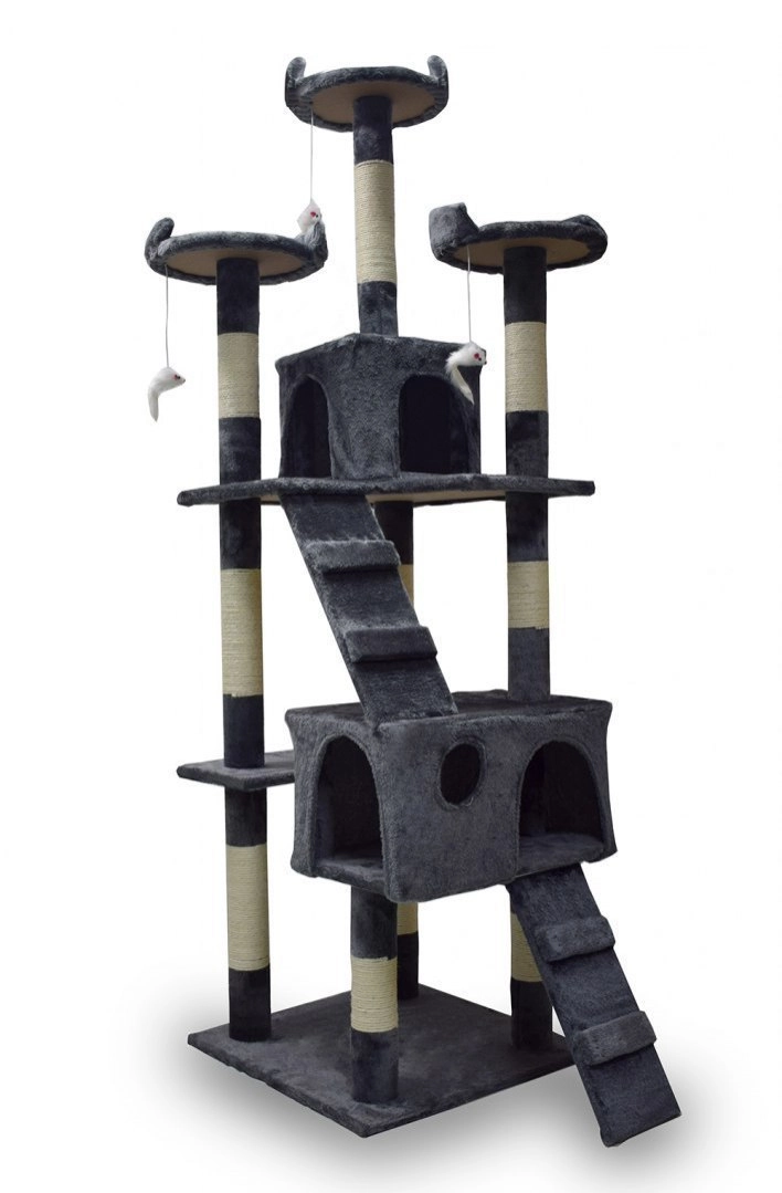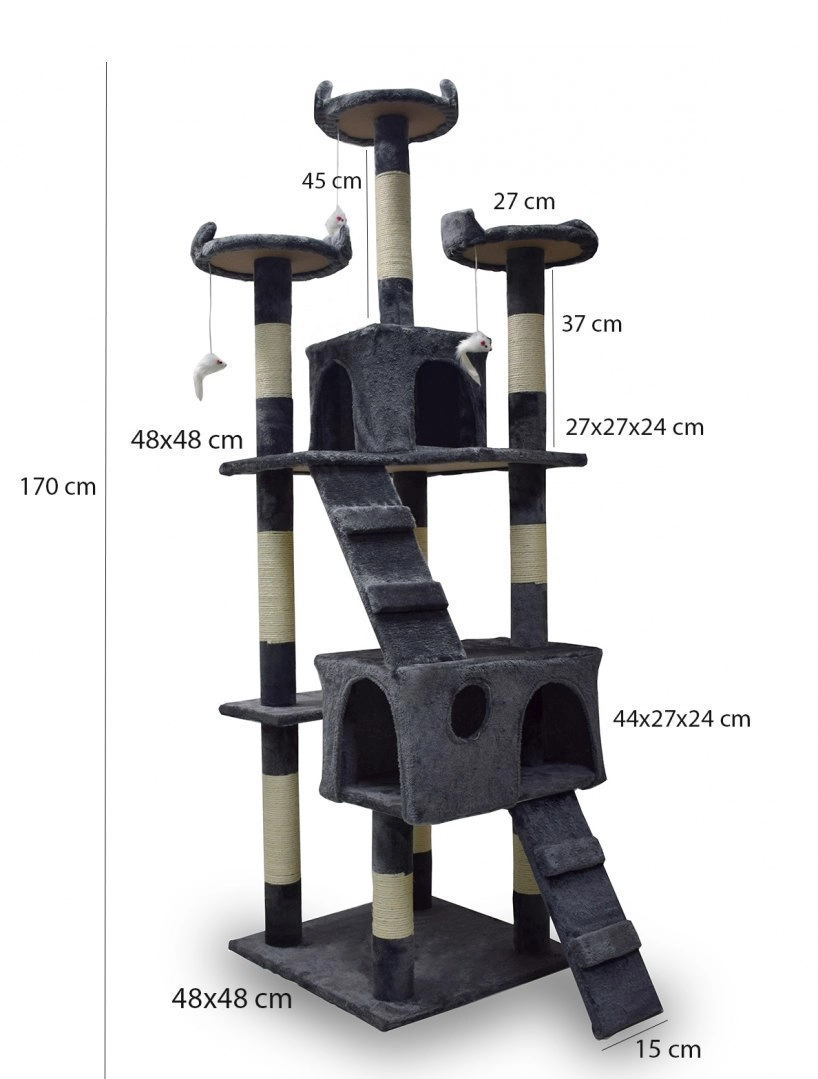 Viacúrovňové mačacie škrabadlo 170 cm v elegantnej tmavosivej farbe ponúka dva útulné domčeky, tri vyhliadkové platformy, sisálové stĺpiky na brúsenie pazúrikov a závesné myšky pre zábavu. Stabilná konštrukcia, mäkký plyš a premyslené členenie zaistia vášmu miláčikovi oddych, hranie aj šplhanie – a zároveň chránia váš nábytok.