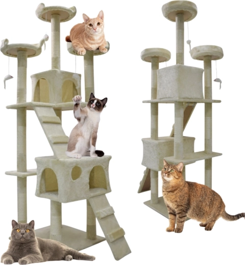 Veľké mačacie škrabacie a herné centrum s výškou 170 cm ponúka všetko pre aktívne aj pokojné mačky: 7 úrovní na lezenie a odpočinok, 2 útulné domčeky, 3 vyhliadkové platformy, sisalové škrabacie stĺpiky, závesné hračky a stabilnú konštrukciu s mäkkým poťahom pre maximálne pohodlie.