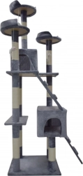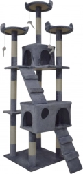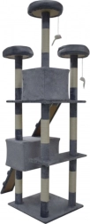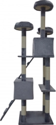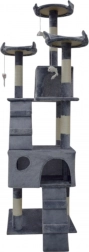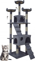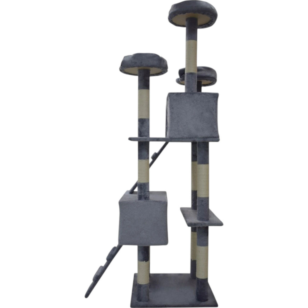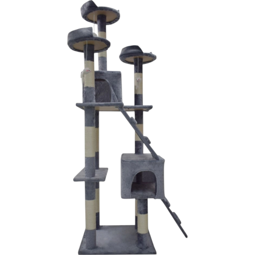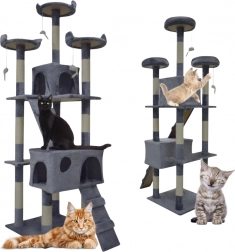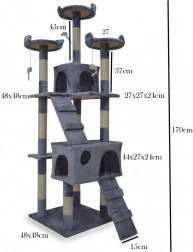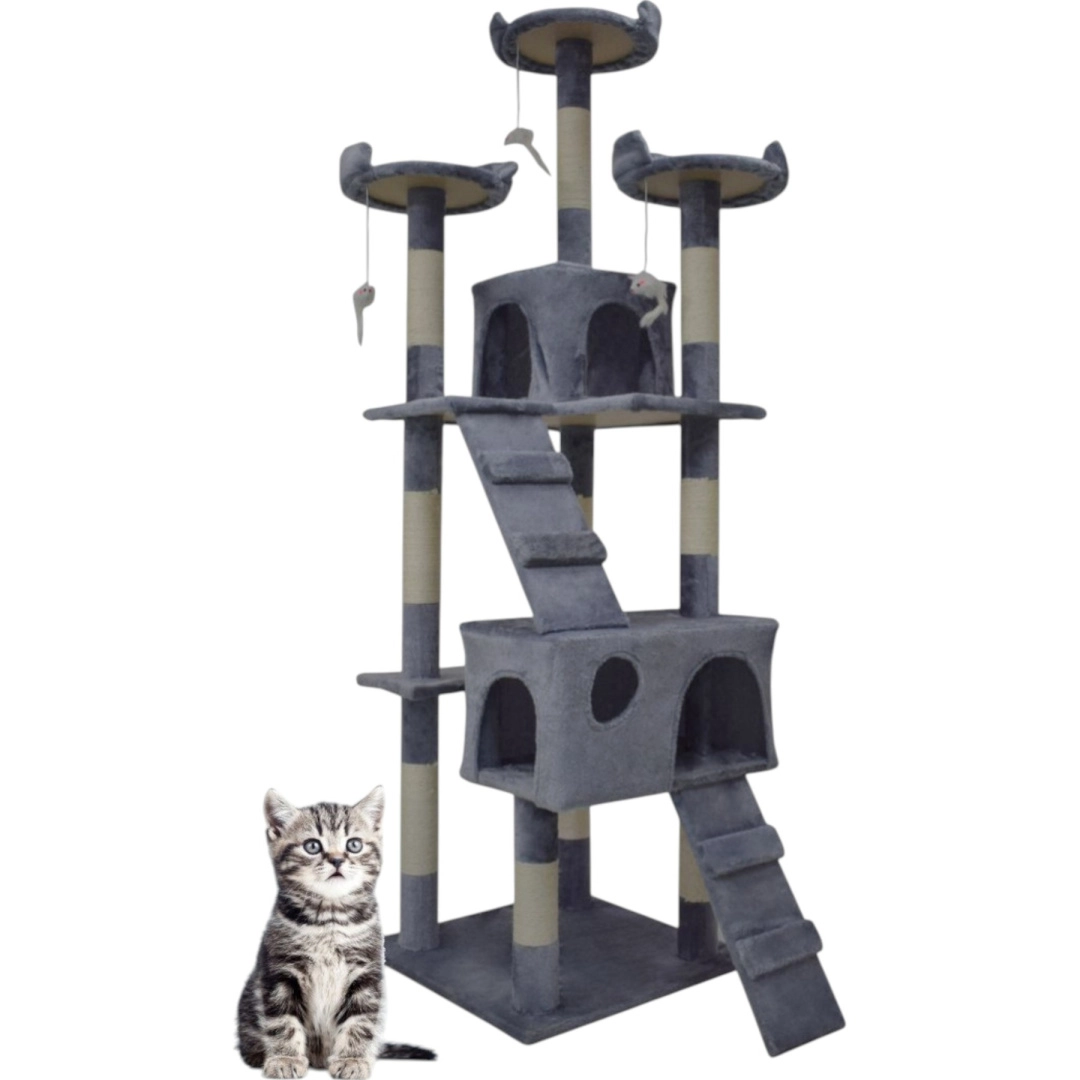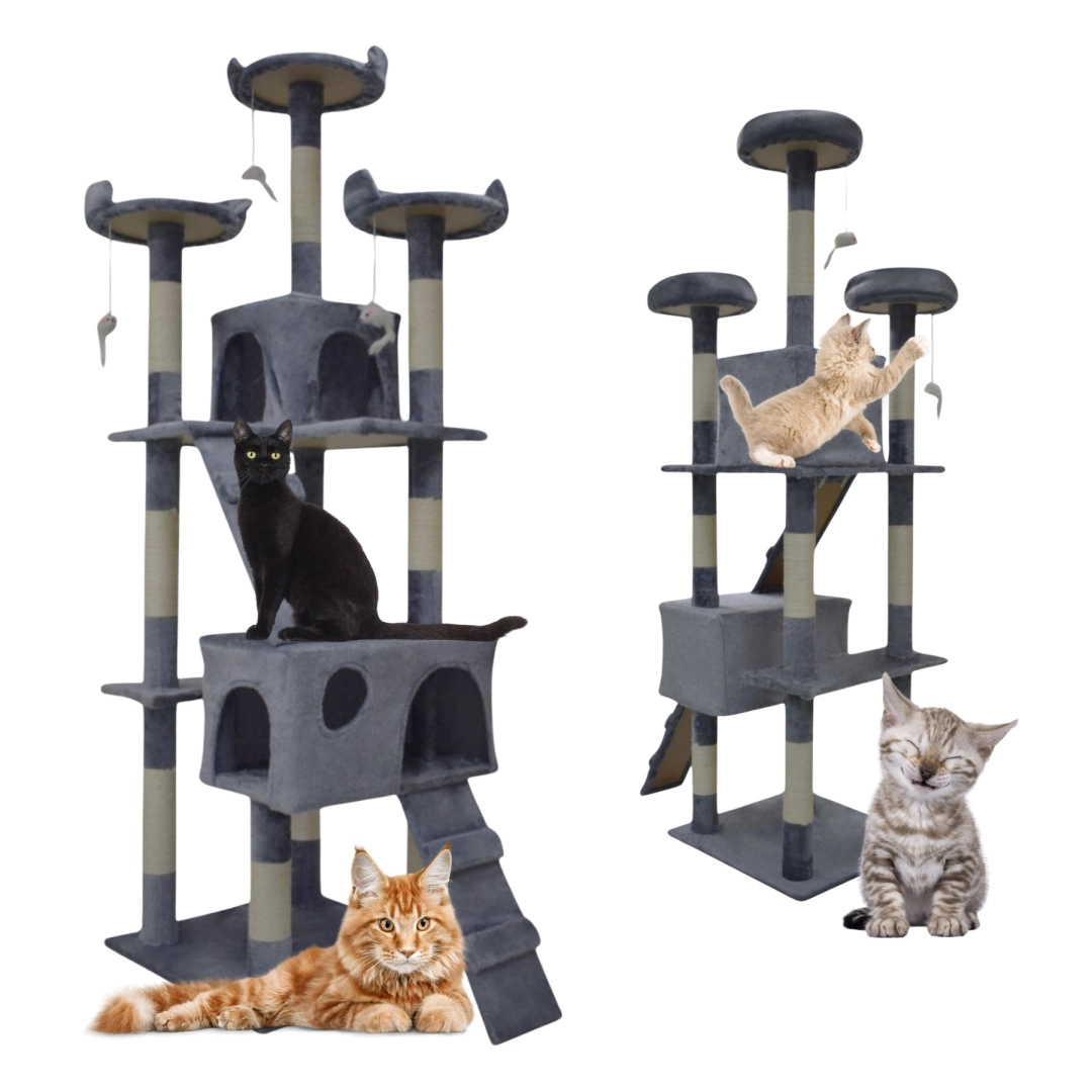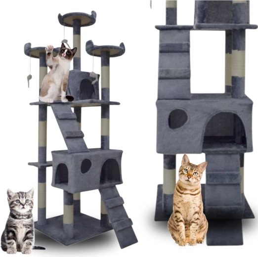 Doprajte svojej mačke vlastné kráľovstvo. Tento veľký mačací strom 170 cm v svetlosivej farbe ponúka mnoho úrovní, dva útulné domčeky, tri vyhliadkové plošiny, mäkké peliešky a sisalové škrabacie stĺpiky, ktoré ochránia váš nábytok. Stabilná konštrukcia, príjemný plyš a visiace hračky zaistia zábavu, odpočinok aj bezpečné lezenie pre mačiatka i dospelé mačky.
