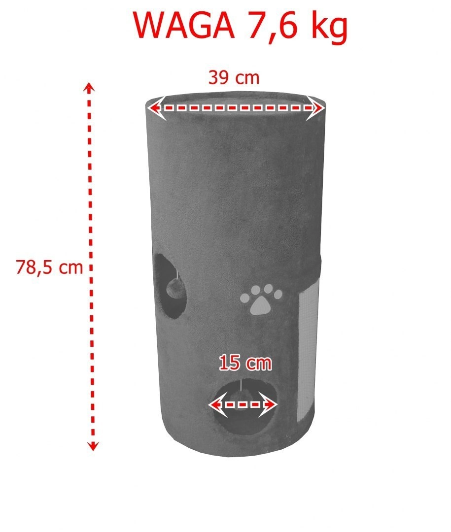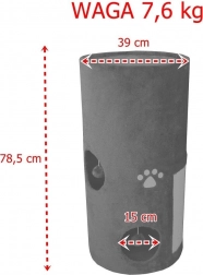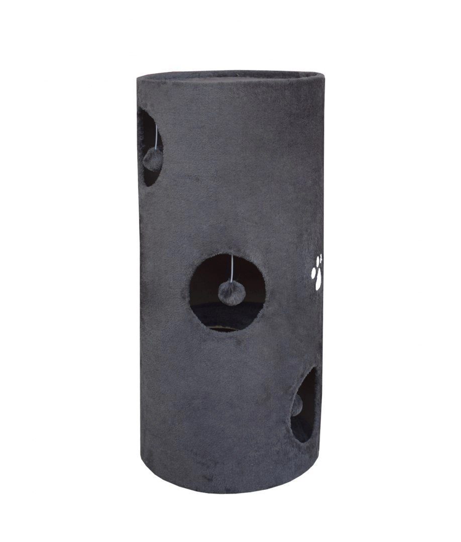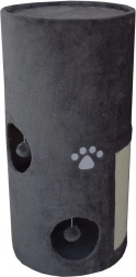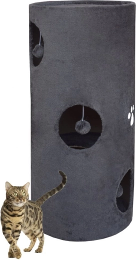Štýlová škrabacia veža pre mačky s výškou 78 cm ponúka niekoľko úkrytov, horný pelech a integrované hračky. Celá je potiahnutá mäkučkým plyšom a vybavená panelom zo sisalu na prirodzené brúsenie pazúrikov. Veža je stabilná, pohodlná a skvele zapadne do interiéru vďaka univerzálnej sivej farbe.