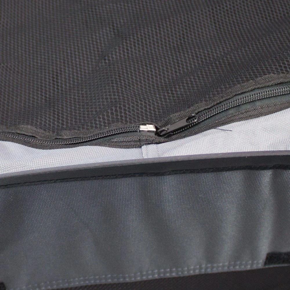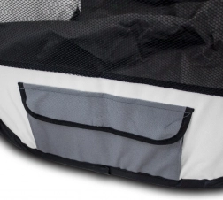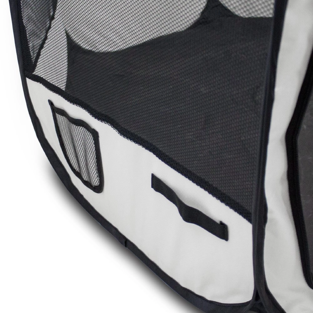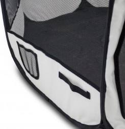 Výbeh má sieťované bočné panely a strop pre perfektnú ventiláciu a dohľad nad zvieraťom. Uzavierateľné vstupy na zips umožnia ľahký prístup, zatiaľ čo pribalené kolíky zaistia stabilitu na záhrade či terase. V balení nájdete tiež praktickú tašku na pohodlný transport a skladovanie.