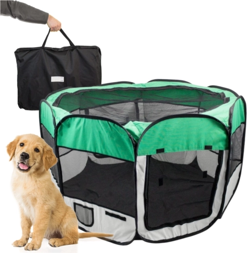 Hľadáte praktické a bezpečné riešenie pre vášho miláčika? Tento veľký zelený výbeh s priemerom 125 cm poskytne psom, mačkám, králikom či morčatám komfortné zázemie. Vďaka systému pop-up ho behom chvíľky rozložíte a opäť zložíte a jeho ľahká, ale odolná polyesterová konštrukcia je pripravená na použitie v interiéri aj exteriéri.