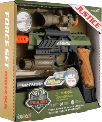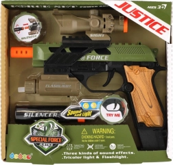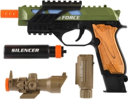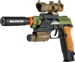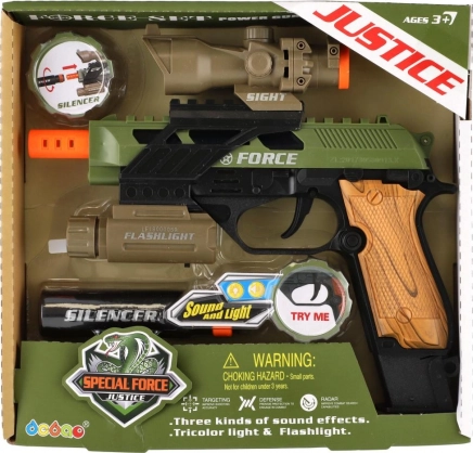 Realisticky vyzerajúca plastová pištoľ pre malých nadšencov akčných hier. Ponúka svetelné efekty, zvukové efekty a praktické doplnky ako zameriavač, svietidlo a tlmič. Funguje na batérie, ktoré sú súčasťou balenia.