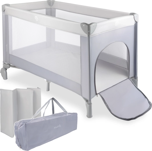 Praktická cestovná postieľka v elegantnej sivej farbe ponúka rýchle rozkladanie a skladanie s bezpečnostnou blokáciou, pohodlný transport vďaka 2 kolieskam a vzdušnosť vďaka 3 sieťovaným stenám. Súčasťou balenia je matrac 60 × 120 cm a prepravná taška; maximálna nosnosť je 15 kg.