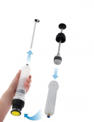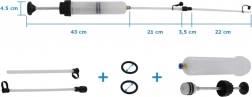 - Pumpa 200 ml, 2× PVC hadica, 2× náhradné tesnenie, 2× gumová zátka, 1× silikónová spojka