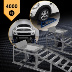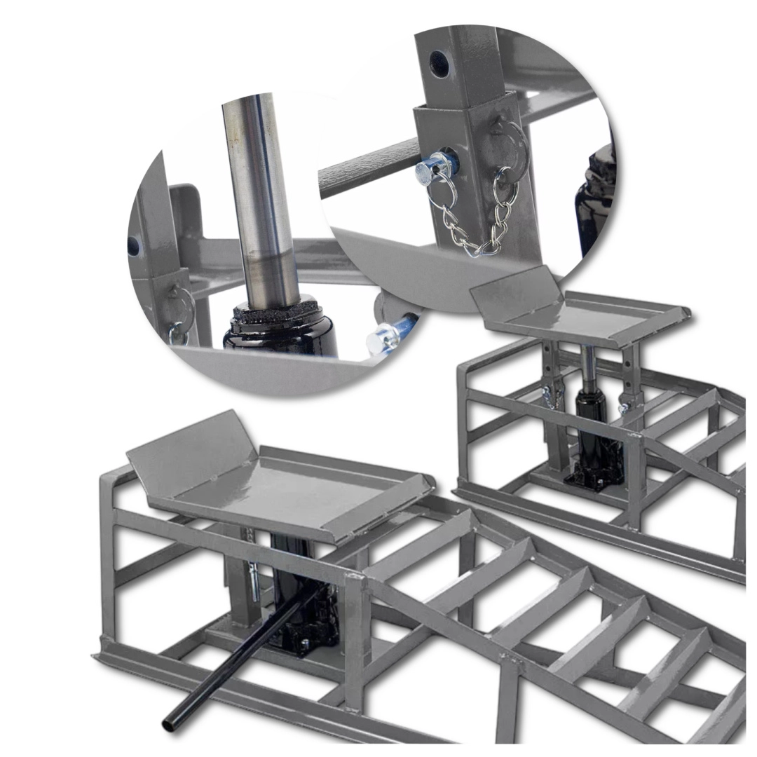 Profesionálny pár nájazdových rámp s integrovaným hydraulickým zdvihákom pre pohodlný servis vozidiel. Ponúka nosnosť 2000 kg na rampu, 4 úrovne výšky (23–34 cm), bezpečnostnú 4-stupňovú blokáciu a odolnú oceľovú konštrukciu v elegantnej grafitovej farbe. Ideálne do dielní, autoservisov aj pre nadšencov do áut.
