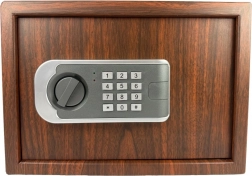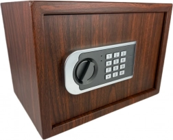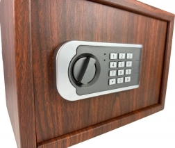 Drevený vzhľad pôsobí elegantne a nenápadne, zatiaľ čo kovové telo s elektronickým panelom a otočným gombíkom zaisťuje spoľahlivú ochranu cenností.