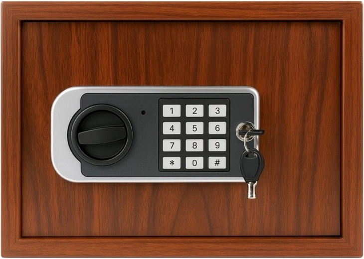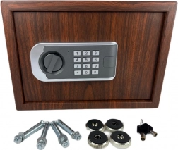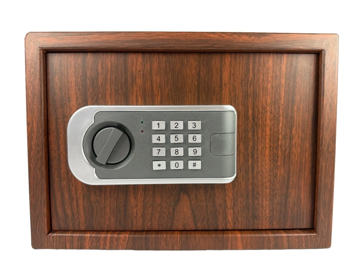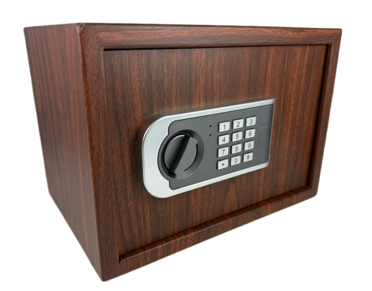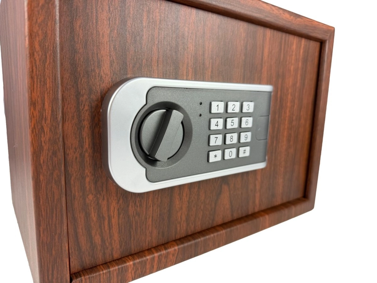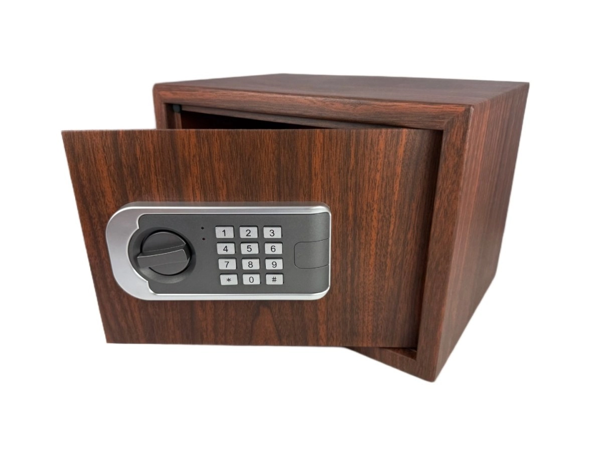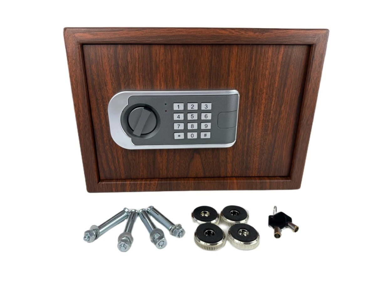Elegantný trezor s dekorom dreva pre domácnosť aj kanceláriu kombinuje štýl a bezpečie. Ponúka dvojitý systém zabezpečenia – elektronický kód aj núdzový kľúč, možnosť ukotvenia do steny alebo podlahy a praktické rozmery pre šperky, dokumenty aj hotovosť.
