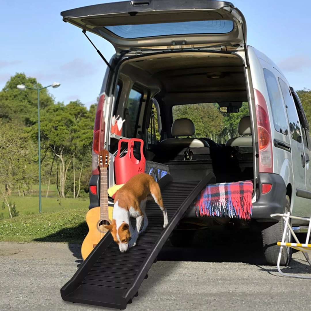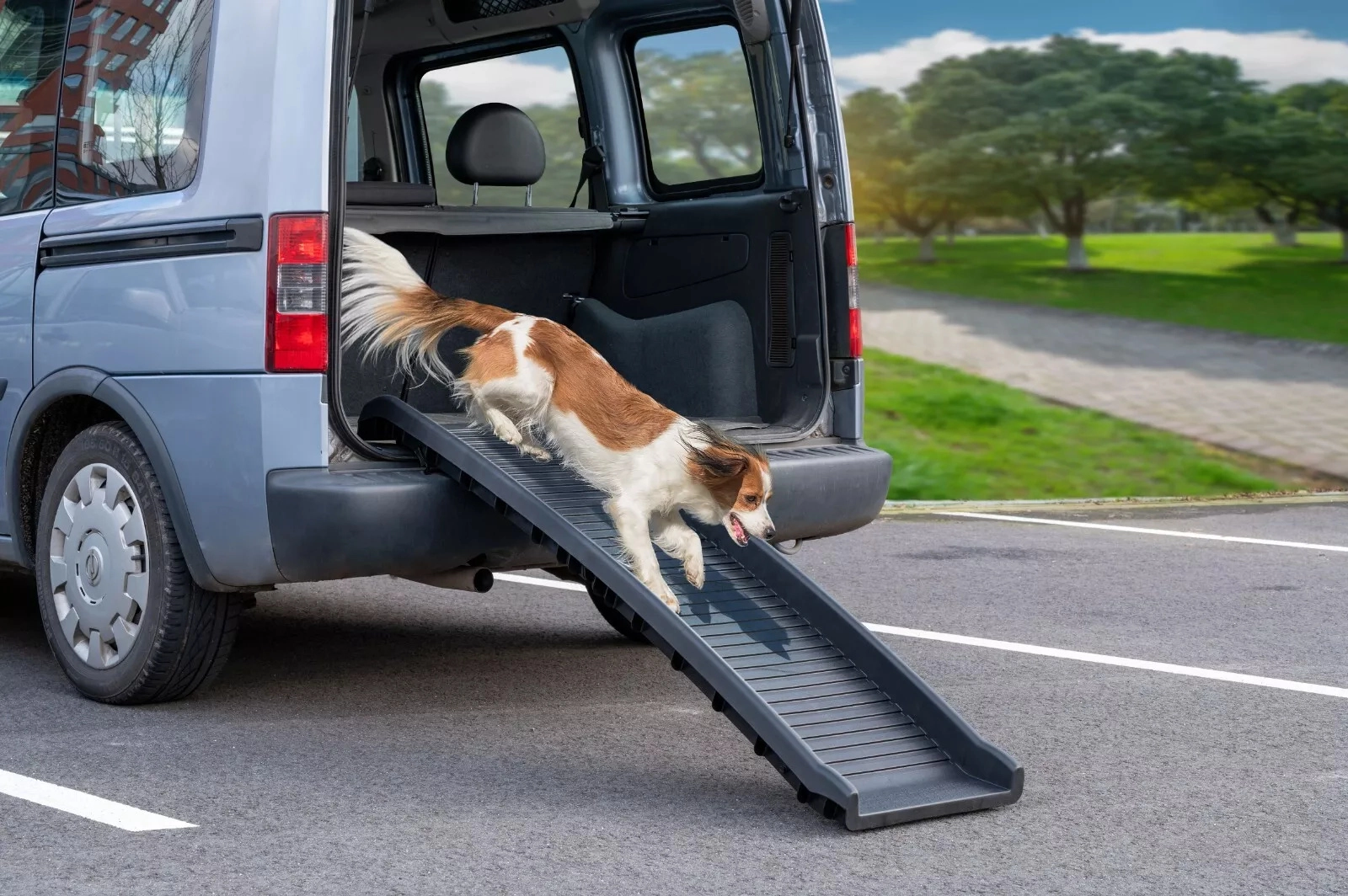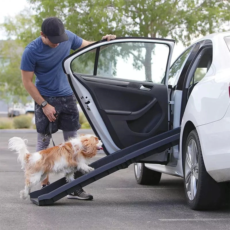 Skladacia rampa pre psy je ideálna pre starších miláčikov, psov s problémami s kĺbmi aj malé plemená. Ľahká konštrukcia (cca 3,9 kg) z odolného plastu a protišmyková nášľapná plocha zaistia vášmu psovi stabilitu a istý krok pri nastupovaní do kufra či na zadné sedadlá.
