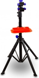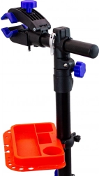 Odkladacia polica s rozmerom 25 × 15 cm udrží skrutky, mazivá aj náradie vždy po ruke. Stojan pojme bicykle do hmotnosti 30 kg, takže je vhodný pre cestné, gravel, MTB aj mestské bicykle.