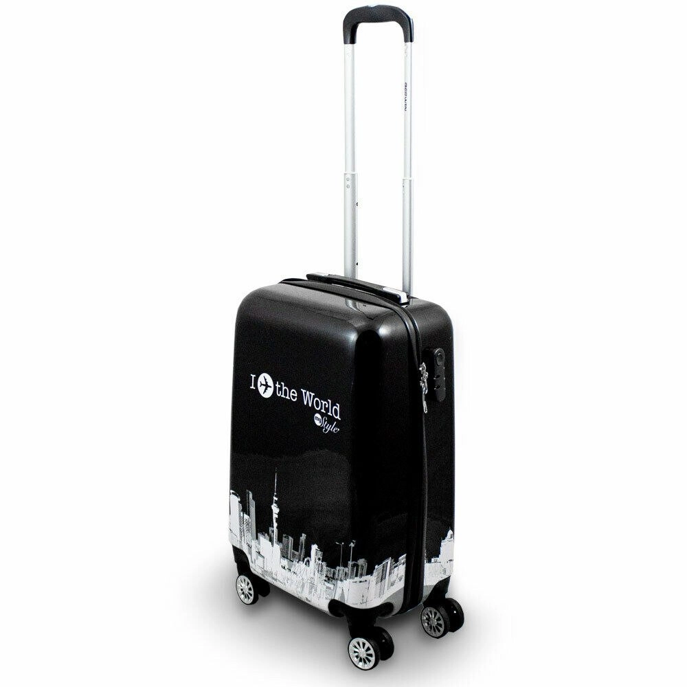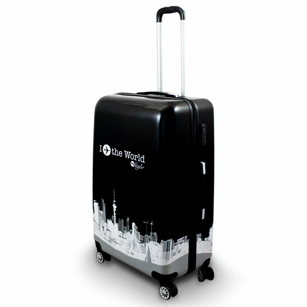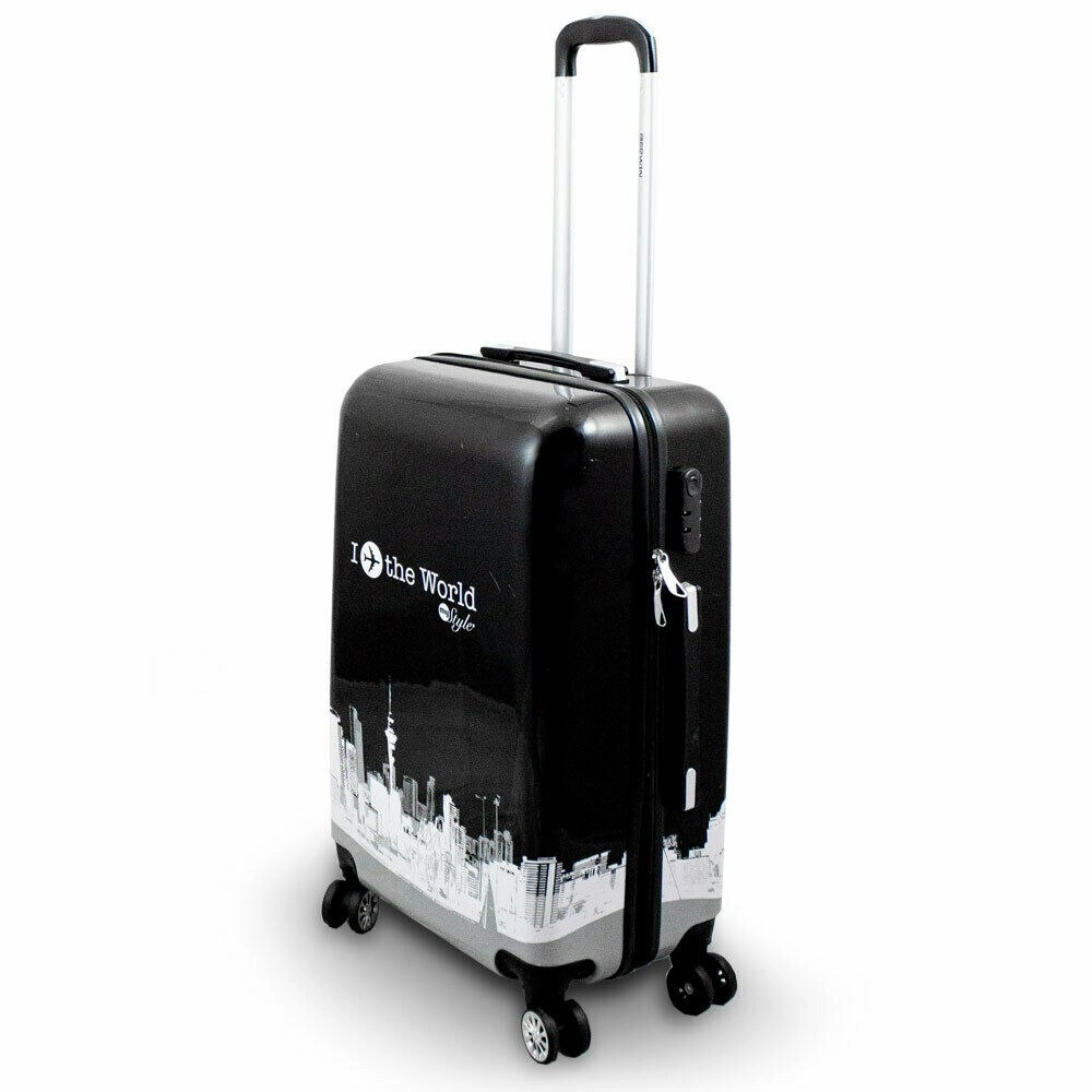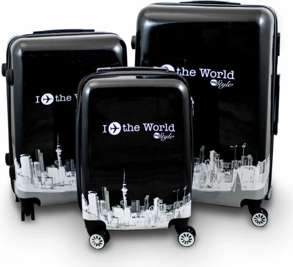 Štýlová sada troch kufrov Fly The World v elegantnom čierno-bielom dizajne s mestským motívom ponúka odolný polykarbonátový škrupinový plášť, 4 otočné kolieska 360° pre hladký pohyb, teleskopickú rukoväť a 3-miestny číselný zámok pre bezpečné cestovanie.