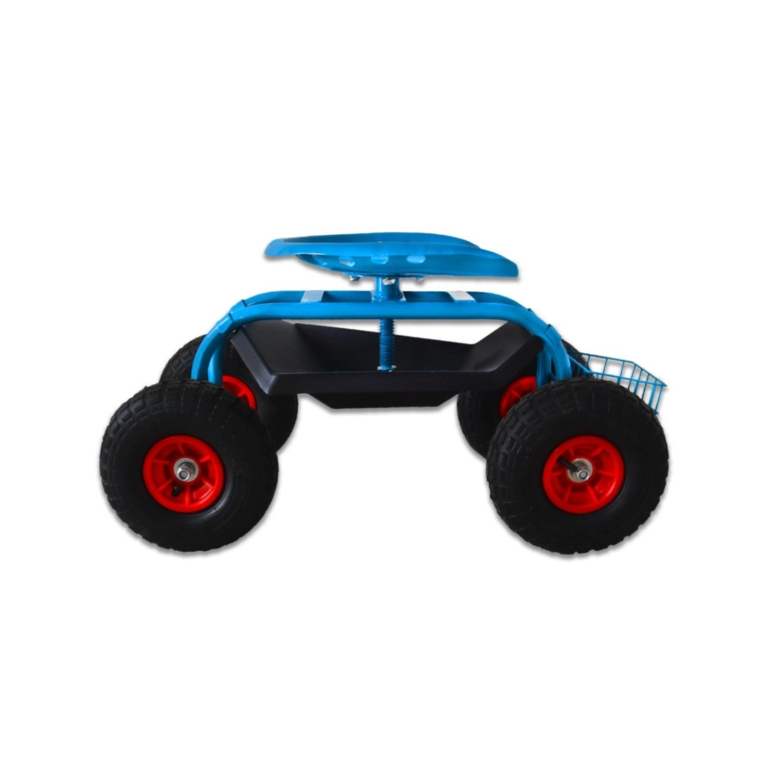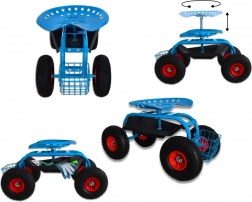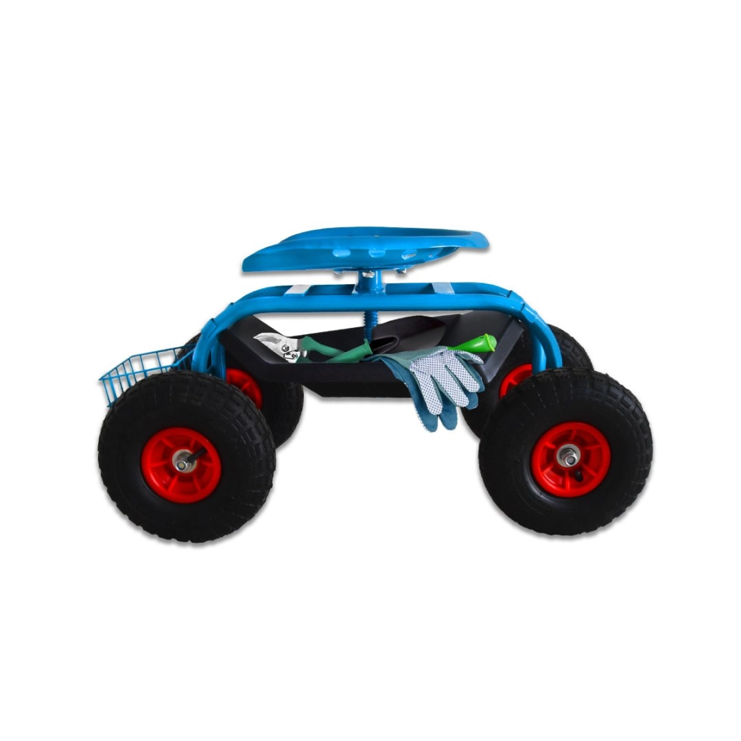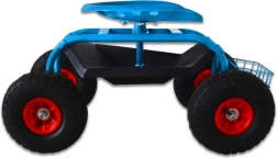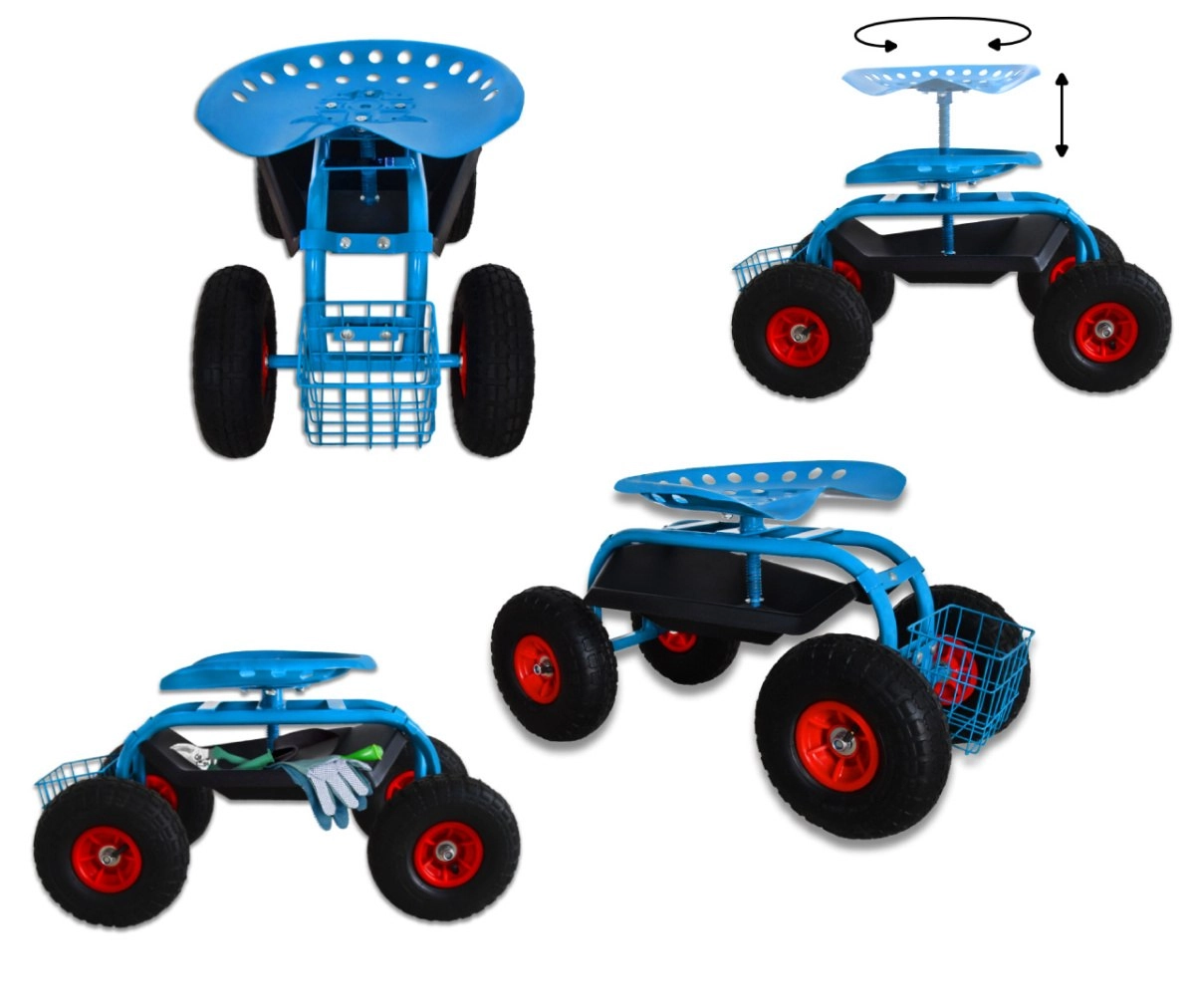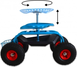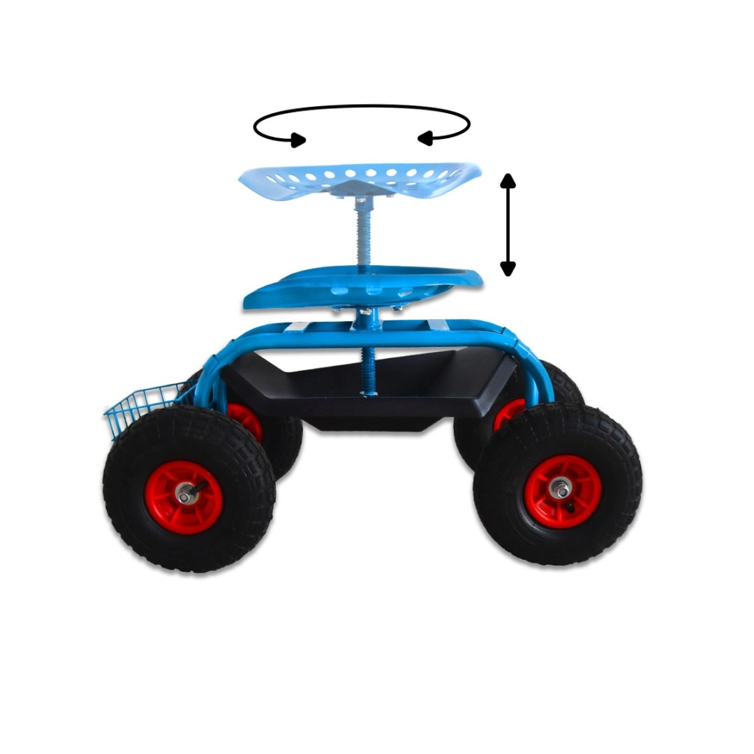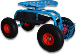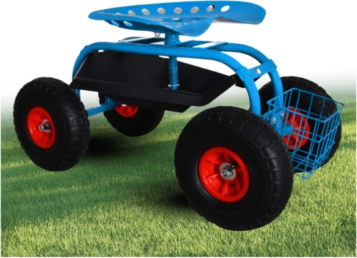 Štyri veľké pneumatické kolesá s protišmykovým dezénom zabezpečujú hladký pohyb po trávniku aj nerovnom povrchu. Traktorové kovové sedlo a pevný oceľový rám garantujú stabilitu a vysokú nosnosť do 150 kg. Pod sedlom nájdete praktickú úložnú tácku na drobnosti a vpredu/držiakový košík na náradie – všetko máte stále poruke.