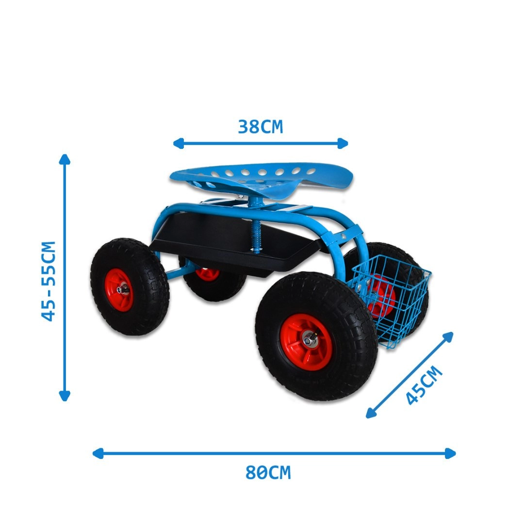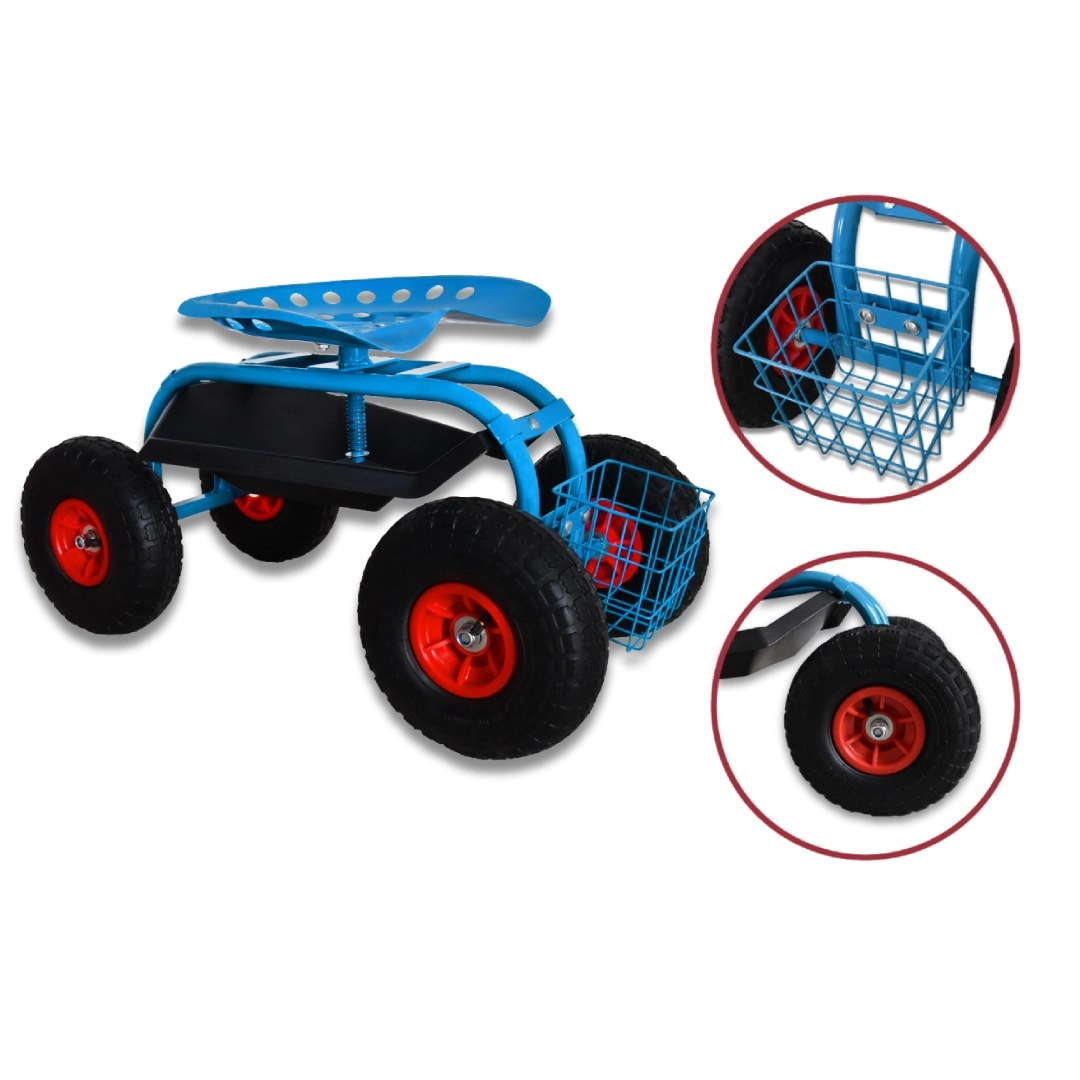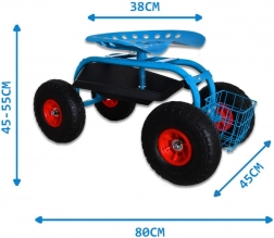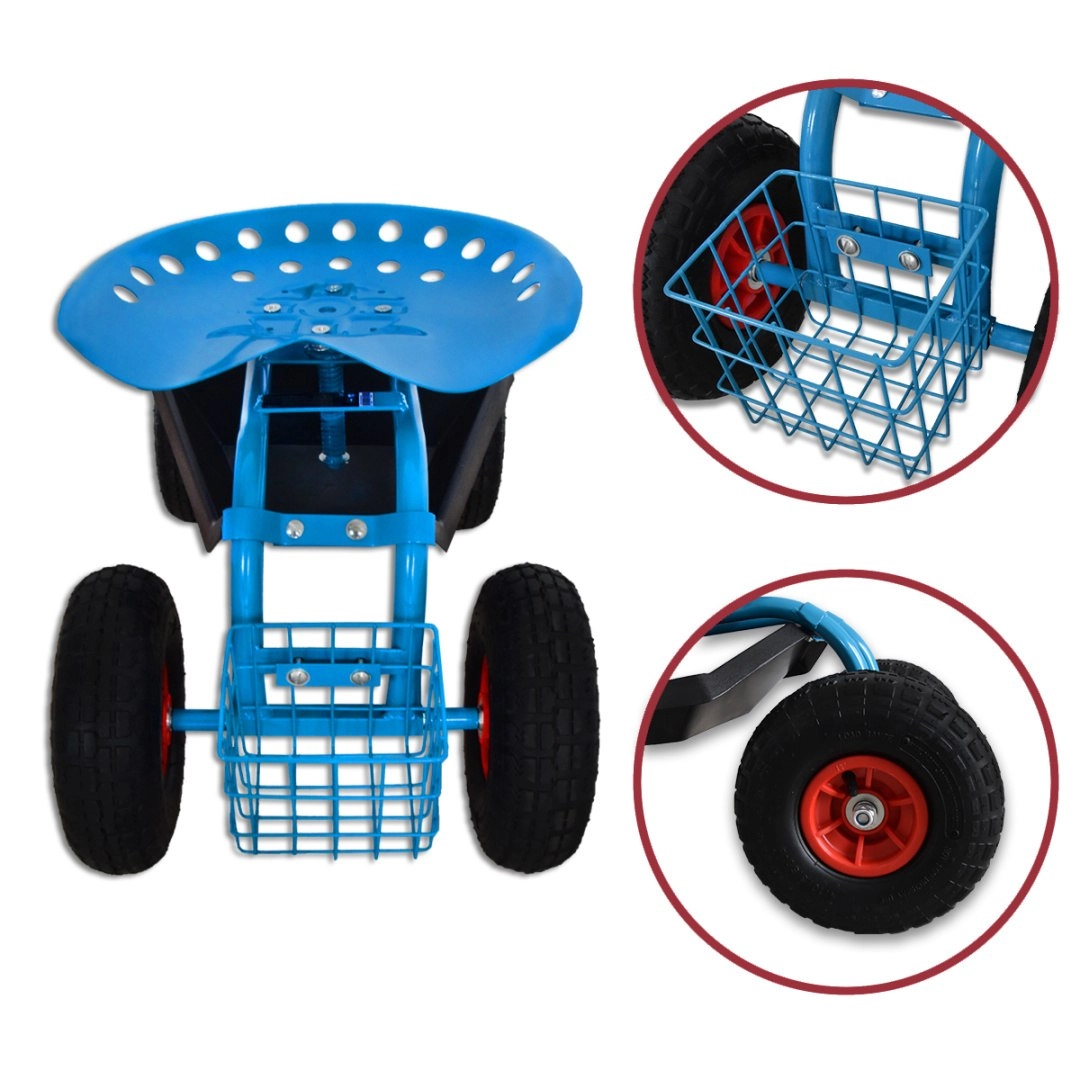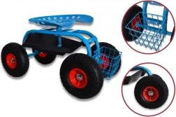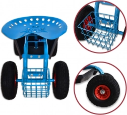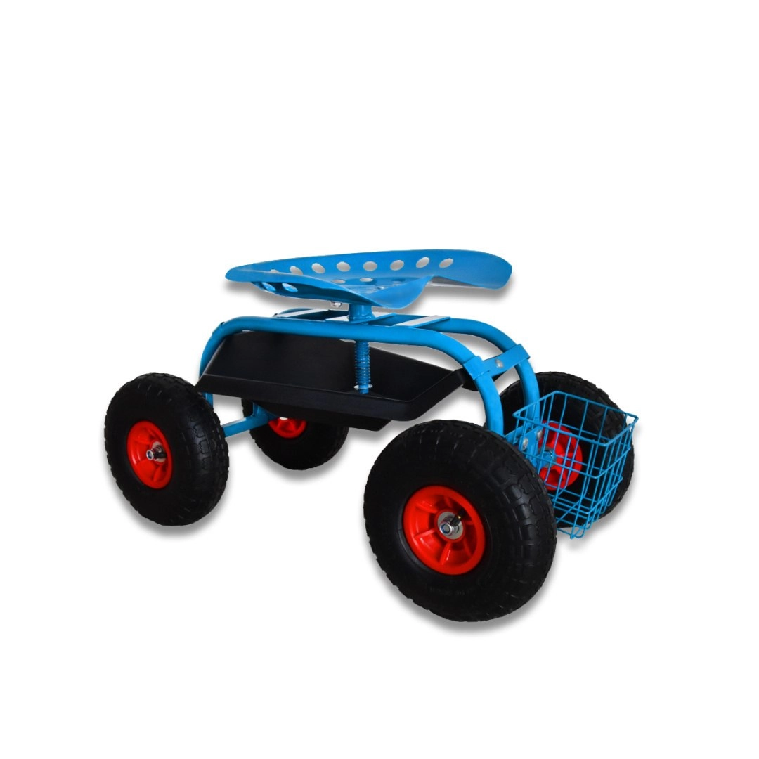 Štyri veľké pneumatické kolesá s protišmykovým dezénom zabezpečujú hladký pohyb po trávniku aj nerovnom povrchu. Traktorové kovové sedlo a pevný oceľový rám garantujú stabilitu a vysokú nosnosť do 150 kg. Pod sedlom nájdete praktickú úložnú tácku na drobnosti a vpredu/držiakový košík na náradie – všetko máte stále poruke.