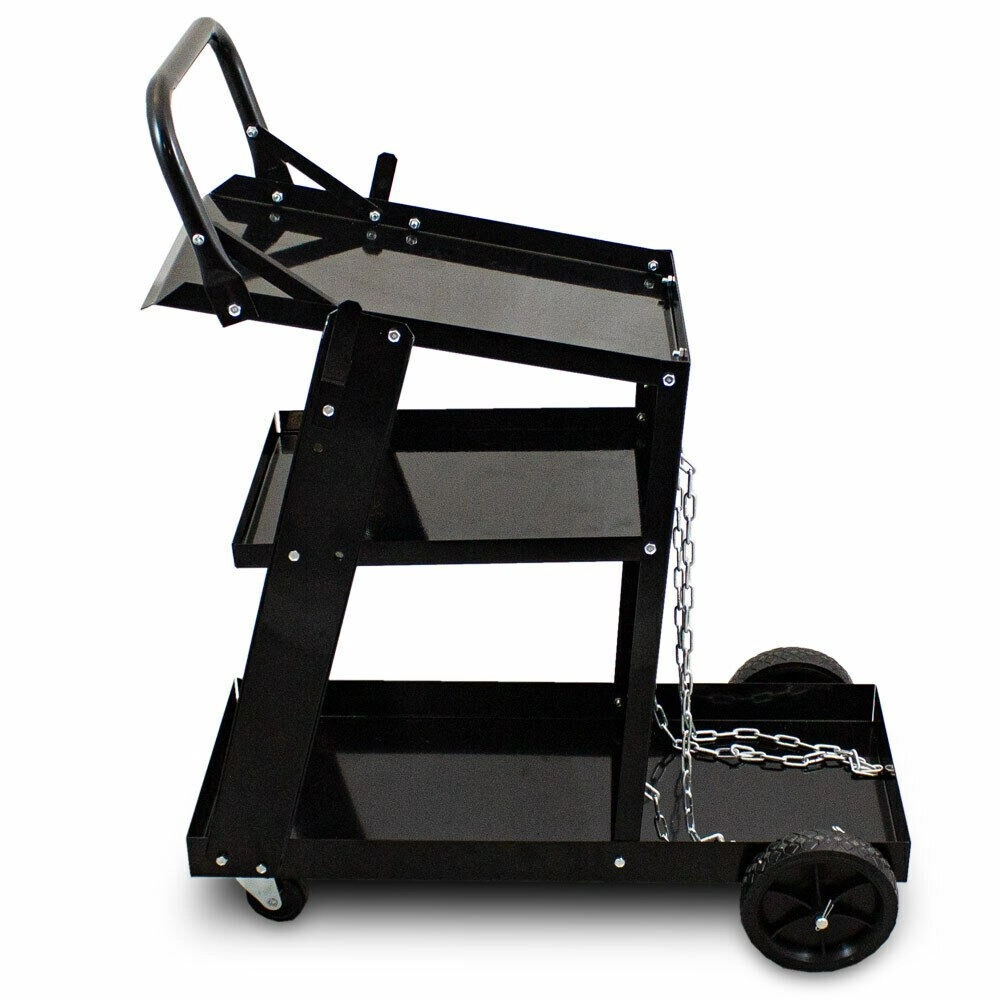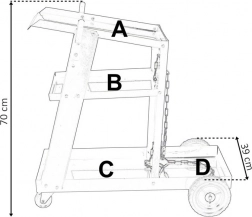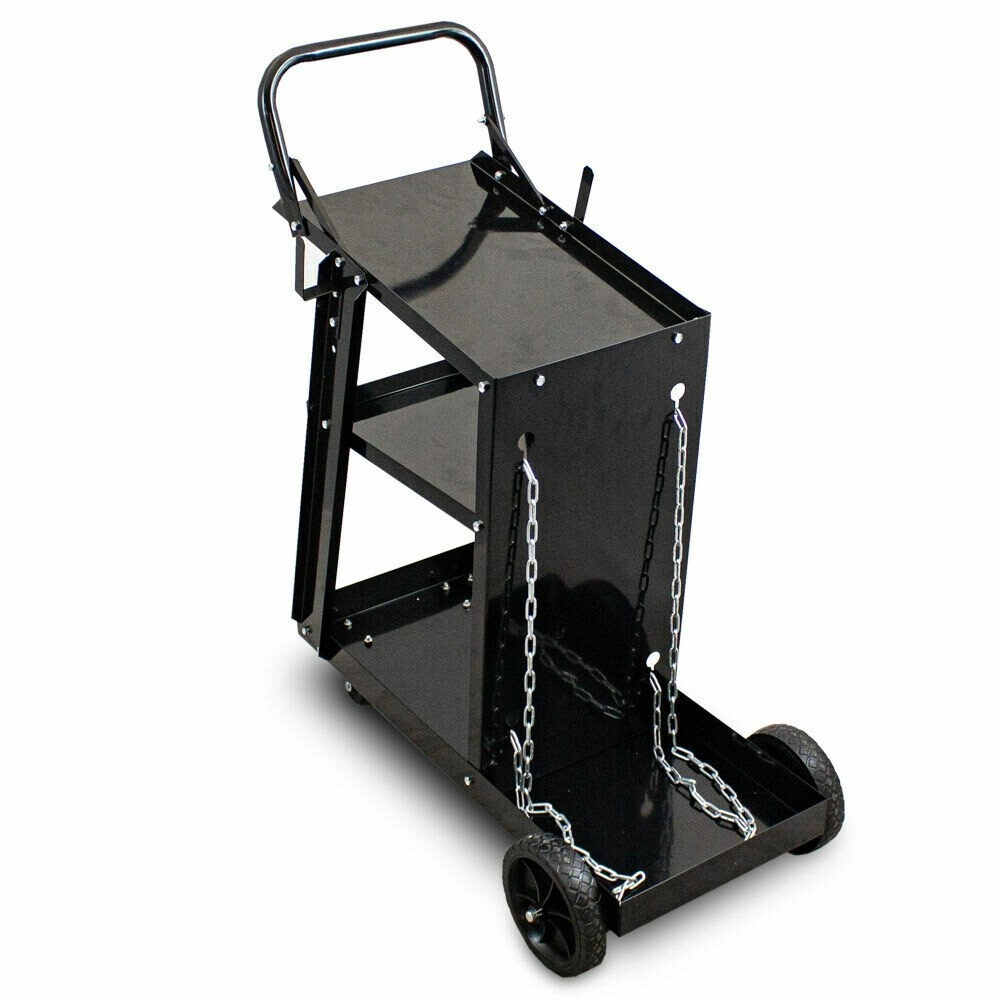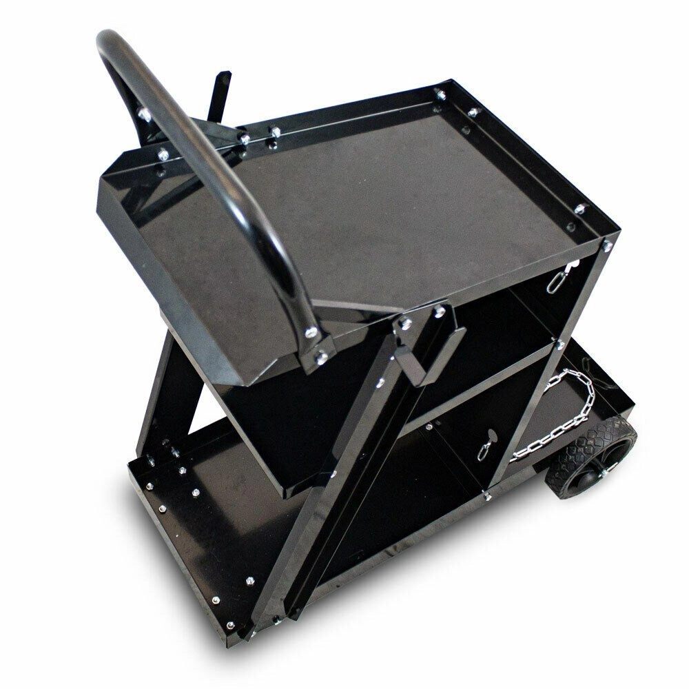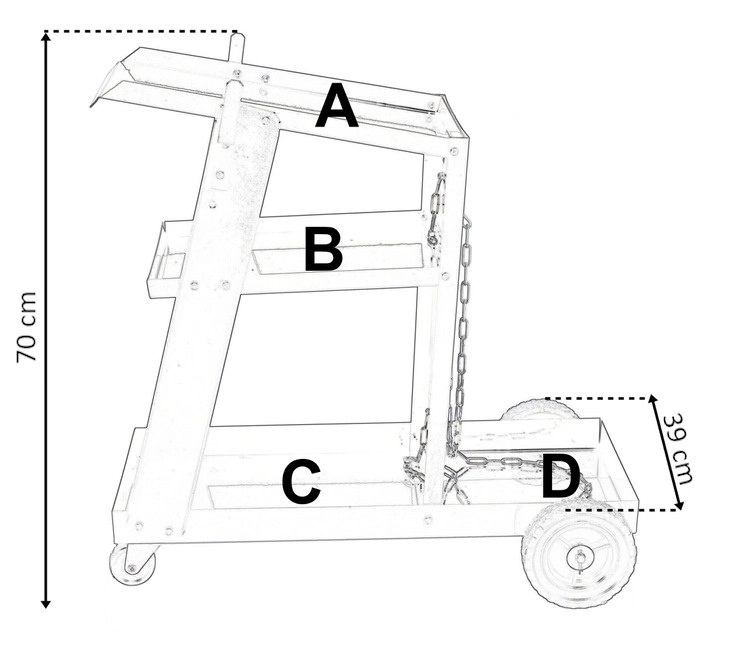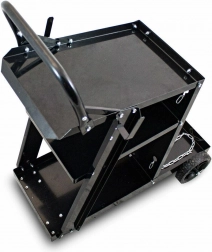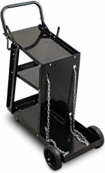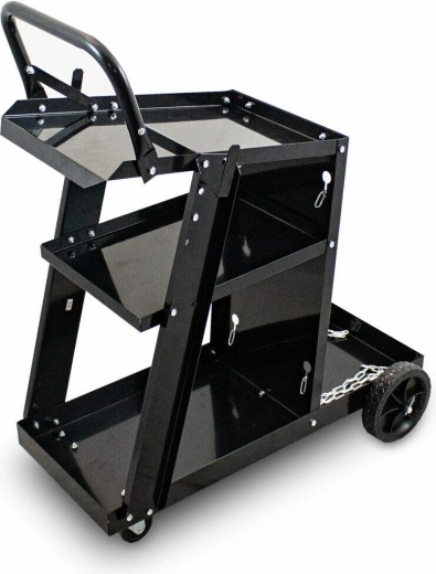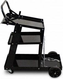 Praktický zvárací vozík do dielne aj garáže s nosnosťou 40 kg, 3 odkladacími policami a držiakom na plynovú fľašu s reťazou. Robustná oceľová konštrukcia, veľké zadné kolesá a predné otočné kolieska zaisťujú jednoduchú manipuláciu a bezpečný transport zváračiek, príslušenstva a plynového vybavenia.