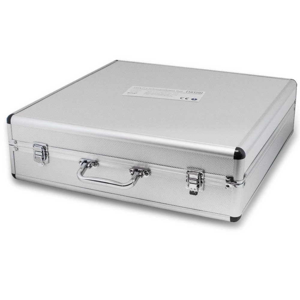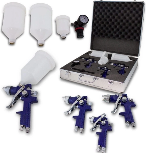 - 3 striekacie pištole (trysky 1,7/1,4/1,0 mm), manometer, 3 nádobky (2 × 600 ml, 1 × 100 ml), 3 sieťové filtre, 3 čistiace kefky, 2 nástroje na výmenu trysiek, kovový kufor s vložkou