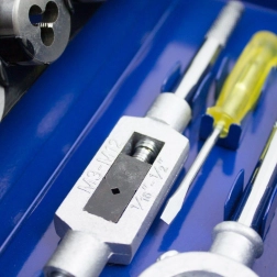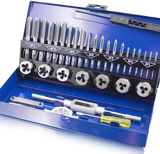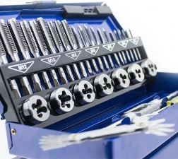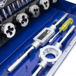 - 21× závitníky a závitové očká (M3–M12), držiak pre očká, skrutkovač, držiaky pre závitníky, držiaky pre očká, úložný kufrík