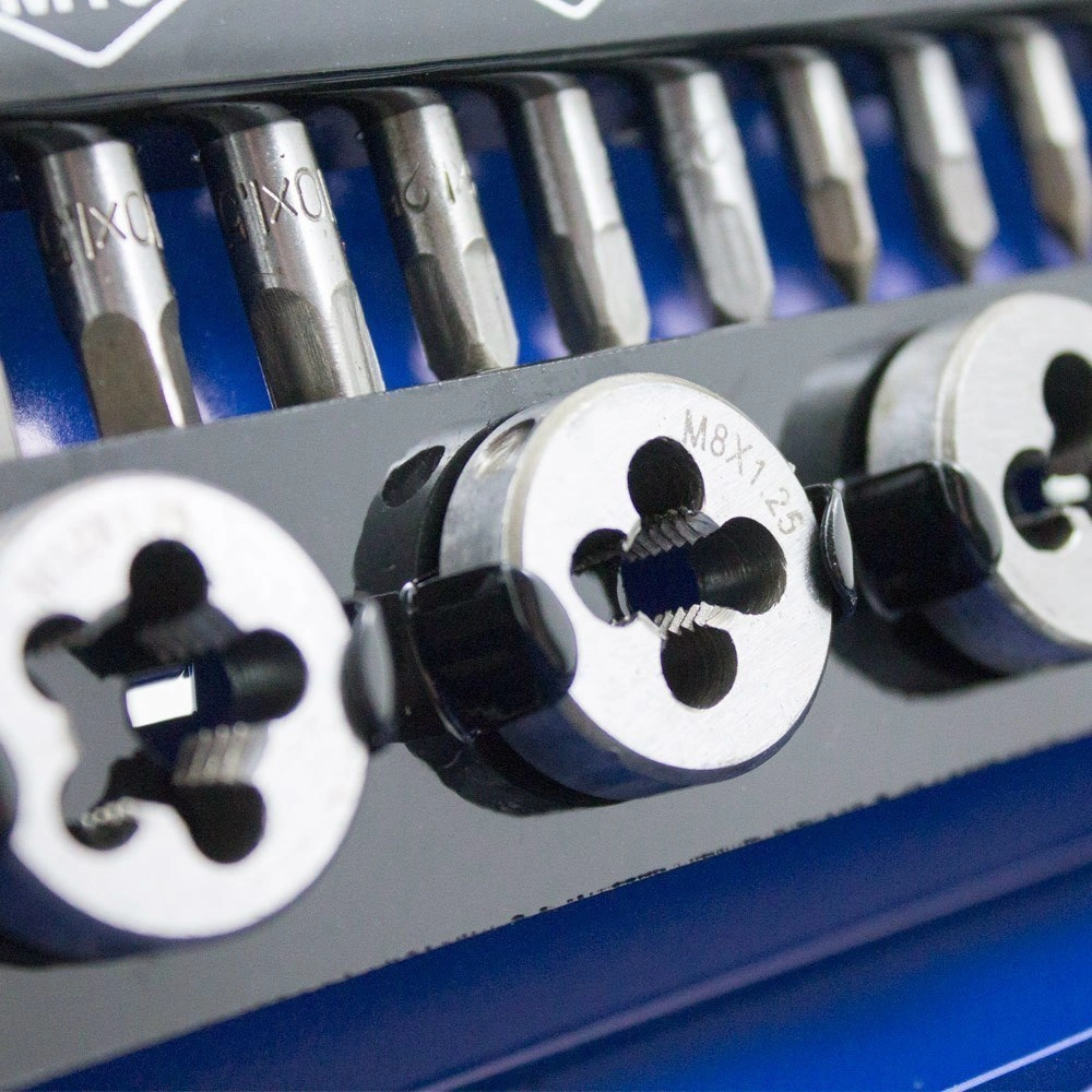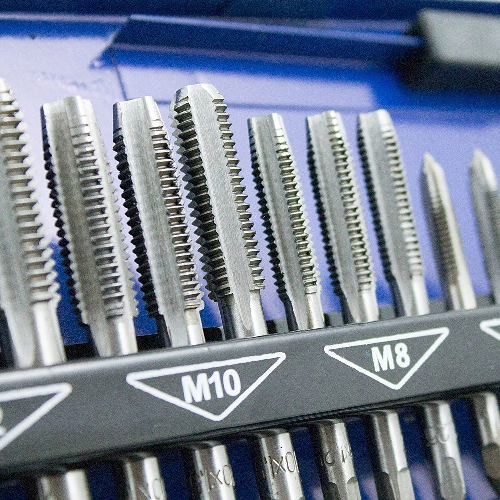 Táto univerzálna súprava na závitovanie ponúka všetko, čo potrebujete na vytváranie vnútorných aj vonkajších závitov. Vďaka kvalitnej wolframovej oceli dosahujú nástroje dlhú životnosť a spoľahlivý výkon aj pri častom používaní. Súprava je vhodná na prácu s oceľou, plastmi aj drevom do pevnosti 900 N/mm².