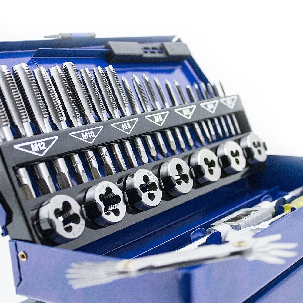 Praktické zloženie zahŕňa závitníky a závitové očká v bežných metrických veľkostiach M3–M12, držiaky, skrutkovač a pevný kufrík na prehľadné uloženie a jednoduché prenášanie.
