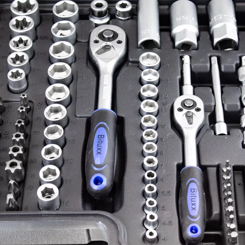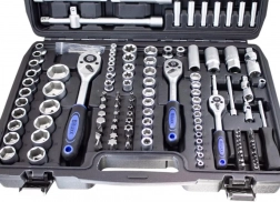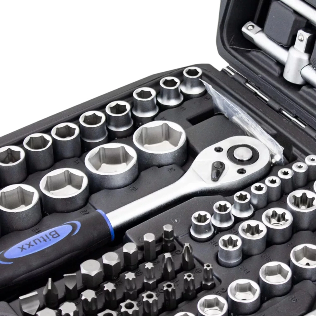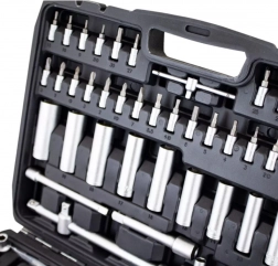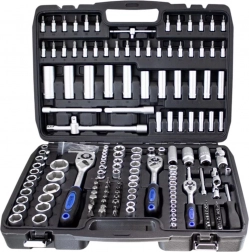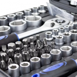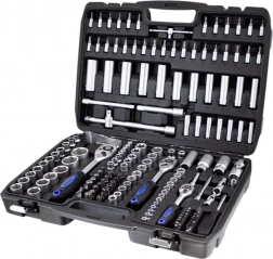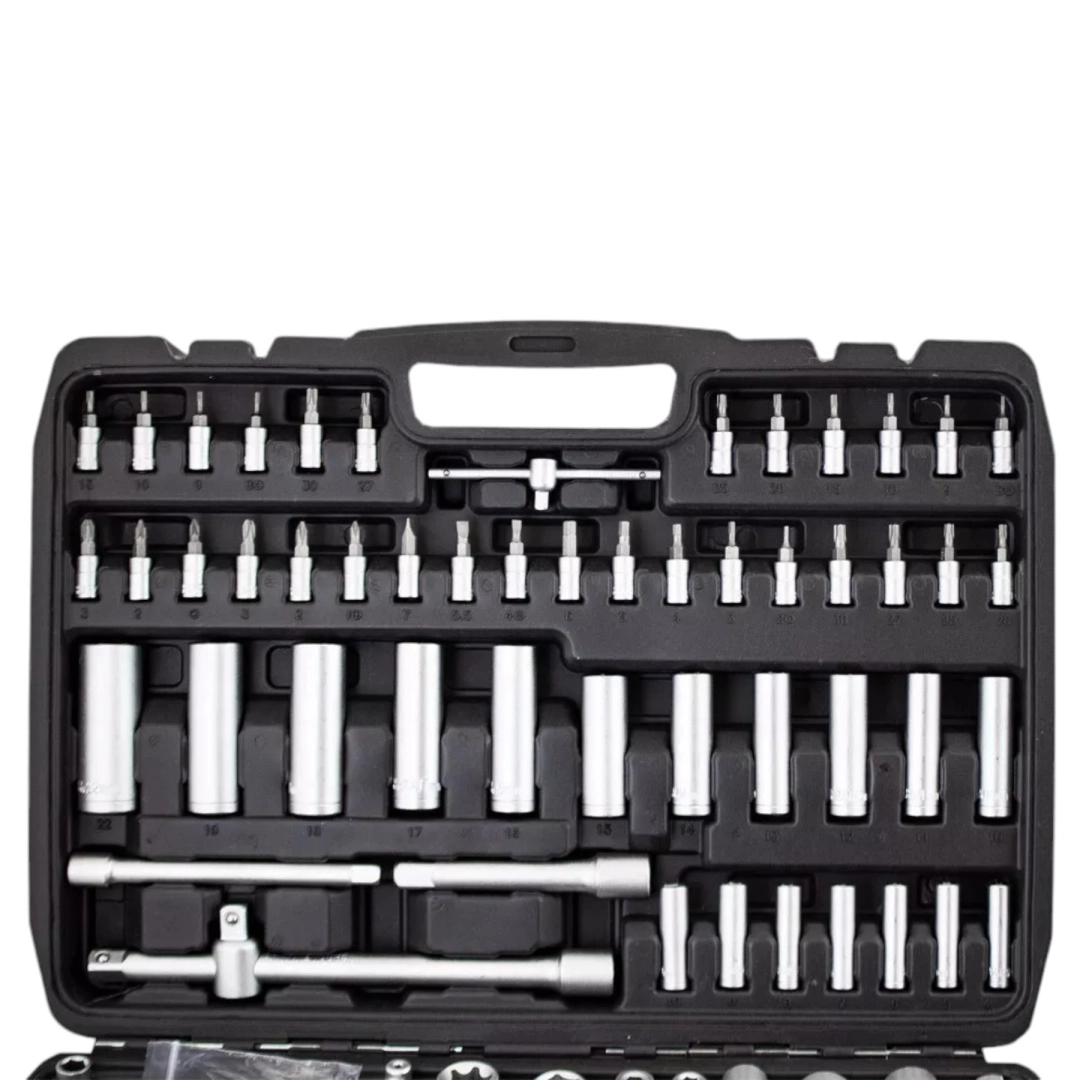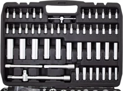 Táto komplexná sada kombinuje široký výber nástavcov 1/4”, 3/8” a 1/2”, rační, predĺžení, adaptérov aj kľúčov pre rýchle a presné povoľovanie a uťahovanie spojov. Chróm‑vanádová oceľ (CrV) zabezpečuje vysokú odolnosť a dlhú životnosť, zatiaľ čo pevný kufor z ABS udržiava všetko prehľadné a vždy po ruke.