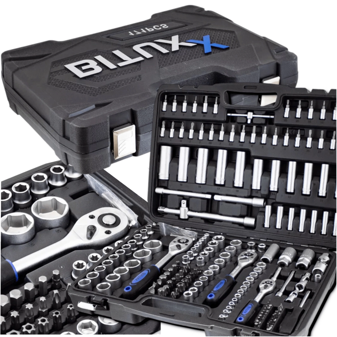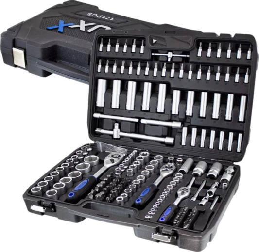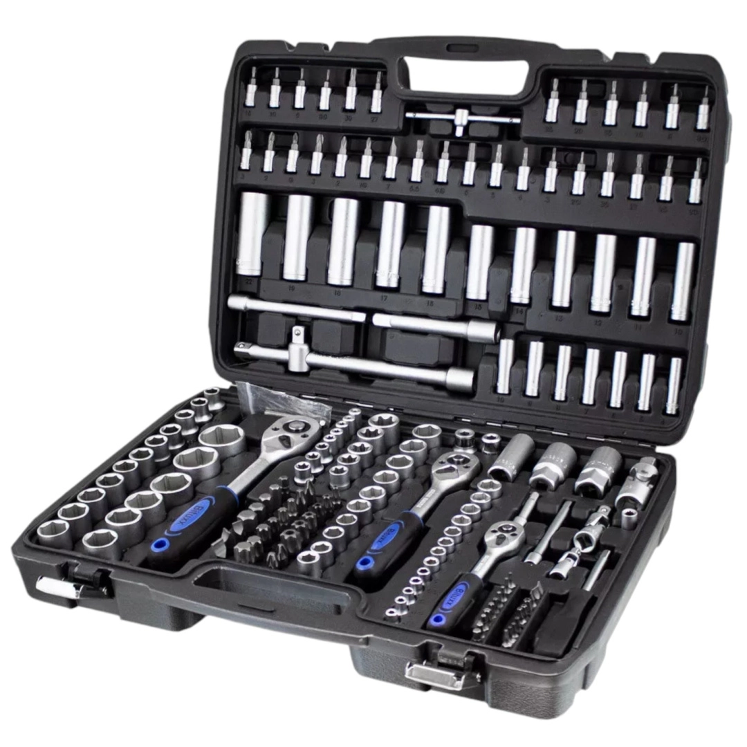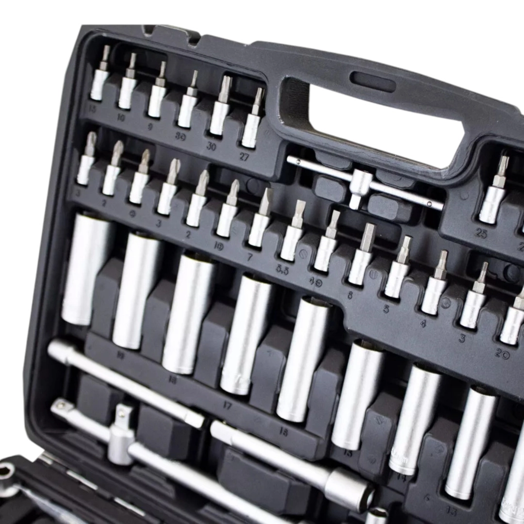 Univerzálna 171-dielna sada náradia z chróm-vanádovej ocele CrV pre dielňu, servis aj domácu garáž. Obsahuje nástavce, račne, bity, predĺženia, kĺby a imbusy v odolnom kufri z ABS plastu na prehľadné uloženie a jednoduché prenášanie. Ideálna pre automoto, inštalácie aj bežné opravy.