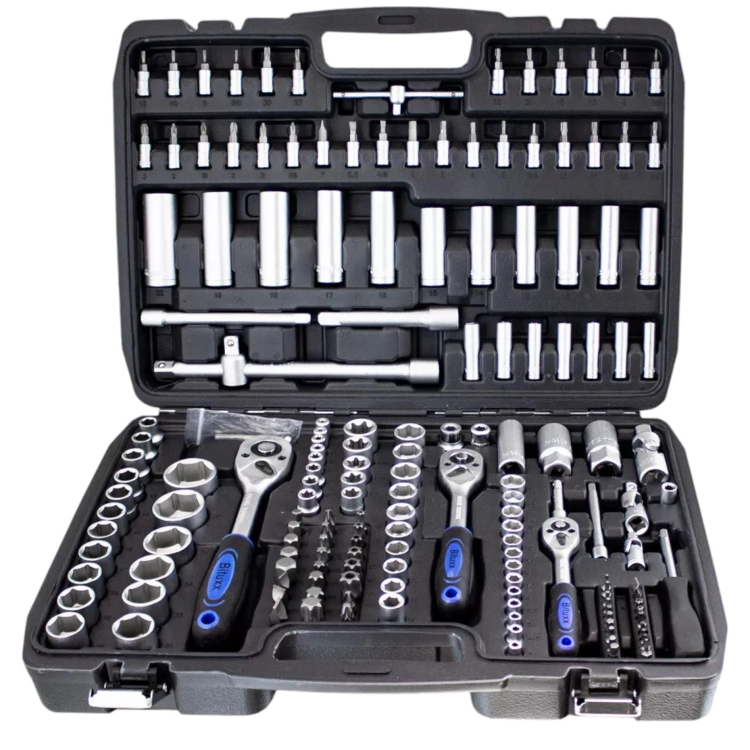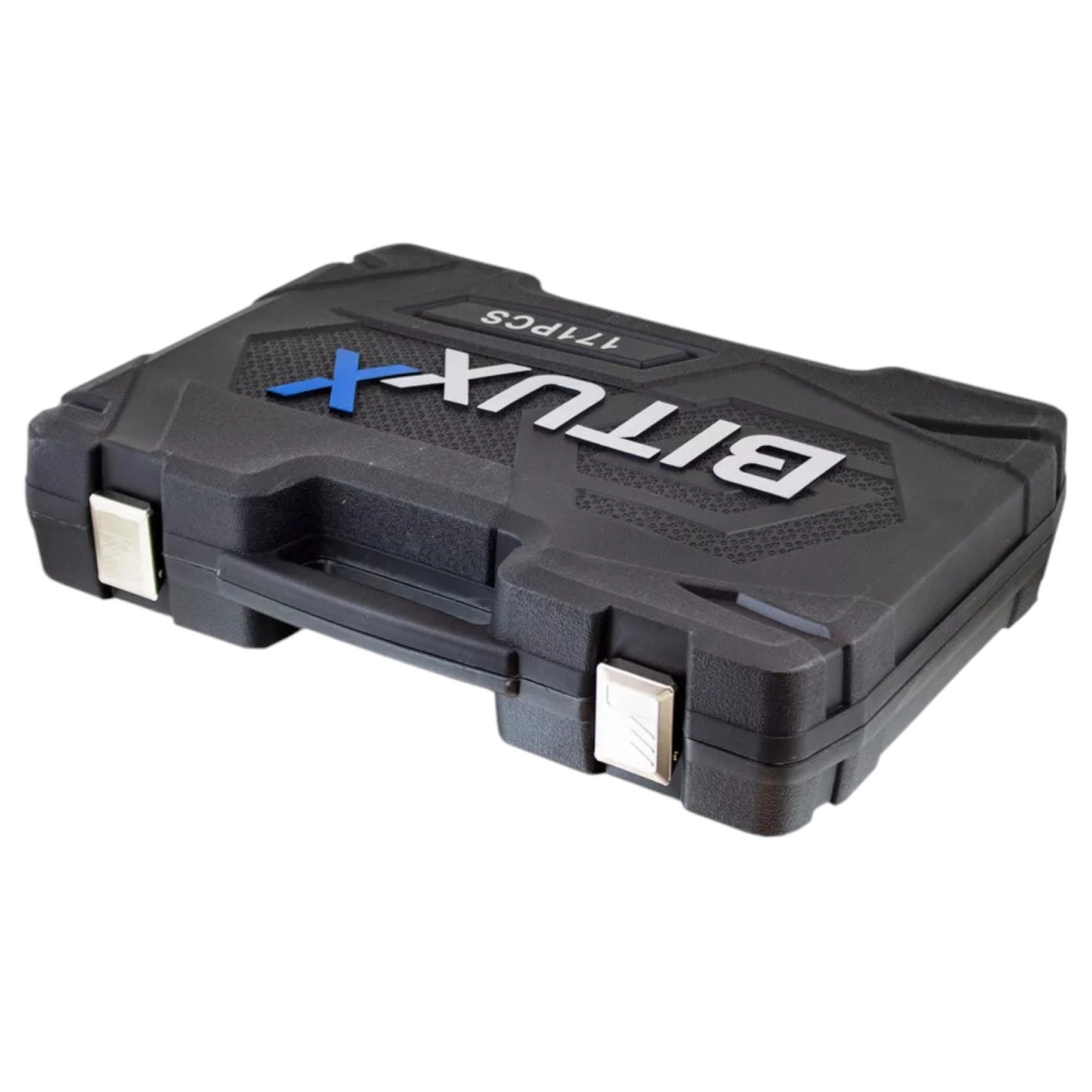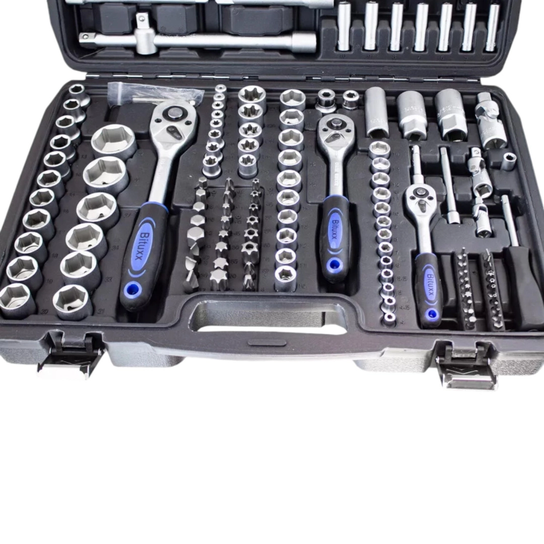 Univerzálna 171-dielna sada náradia z chróm-vanádovej ocele CrV pre dielňu, servis aj domácu garáž. Obsahuje nástavce, račne, bity, predĺženia, kĺby a imbusy v odolnom kufri z ABS plastu na prehľadné uloženie a jednoduché prenášanie. Ideálna pre automoto, inštalácie aj bežné opravy.