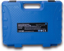 Náradie je prehľadne uložené v pevnom plastovom kufri s madlom a západkami, takže je vždy po ruke a dobre chránené. Sada pokrýva najčastejšie úkony na bubnových brzdách – od manipulácie s pružinami cez čistenie čeľustí až po prácu s brzdovými vedeniami.