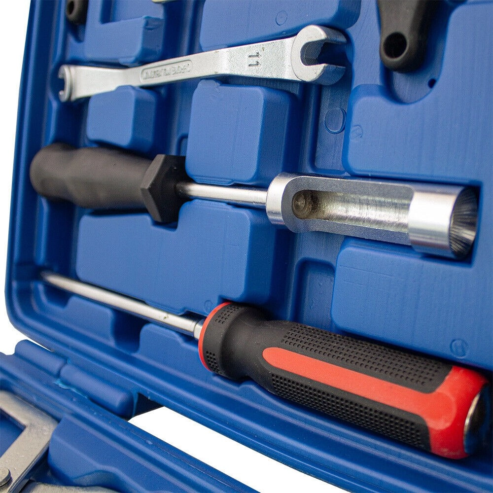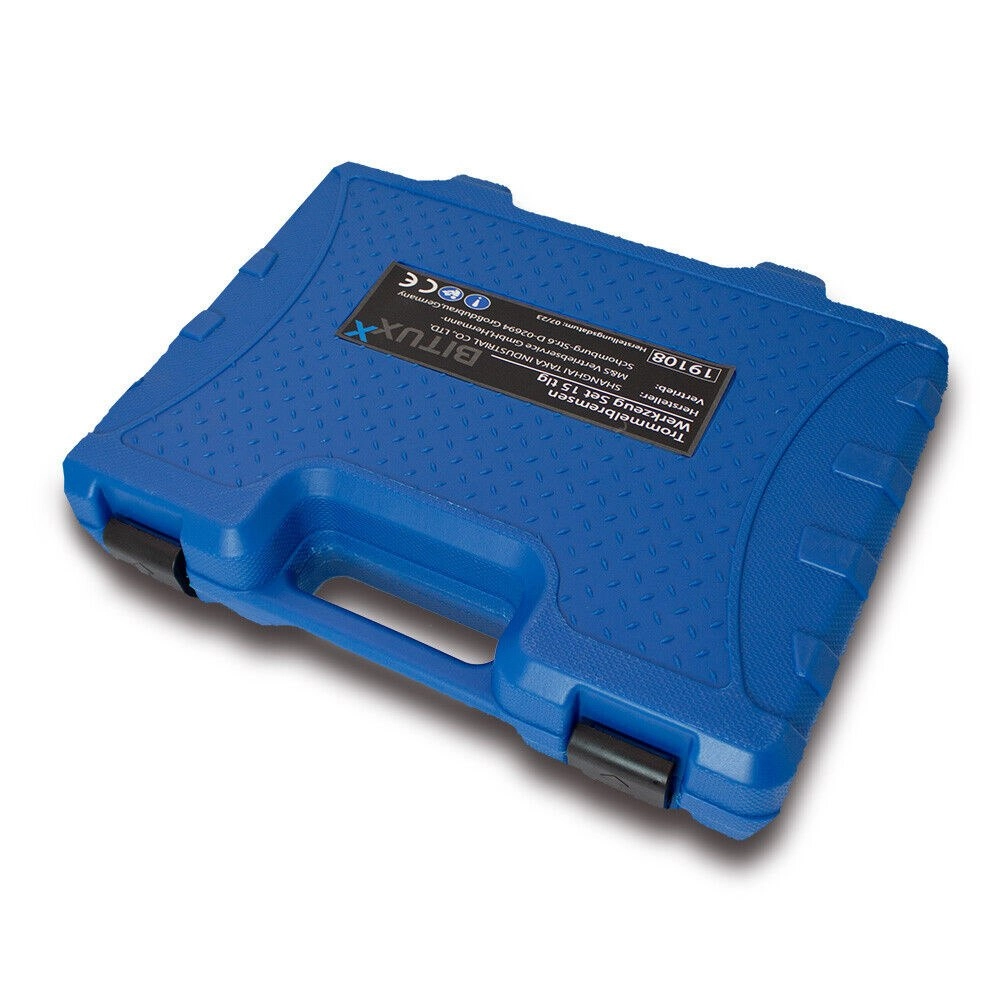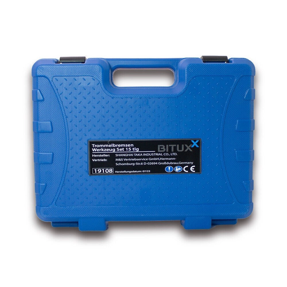 Kompletná 15-dielna sada na údržbu a opravy bubnových bŕzd v praktickom kufri. Obsahuje špecializované kliešte, háky, kefy a bity na rýchlu, bezpečnú a presnú prácu na brzdovom systéme.