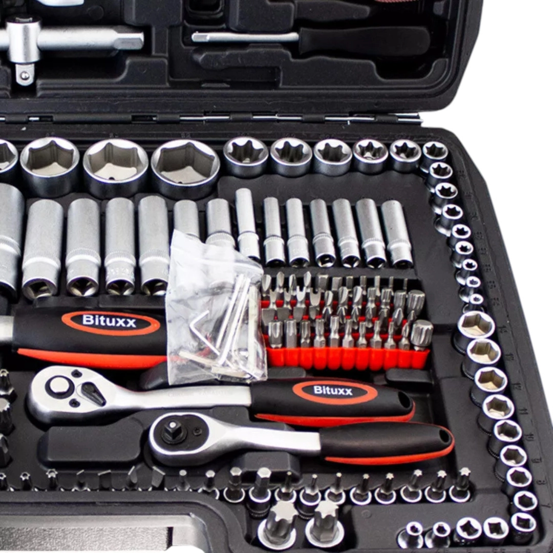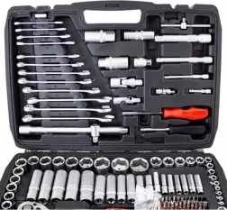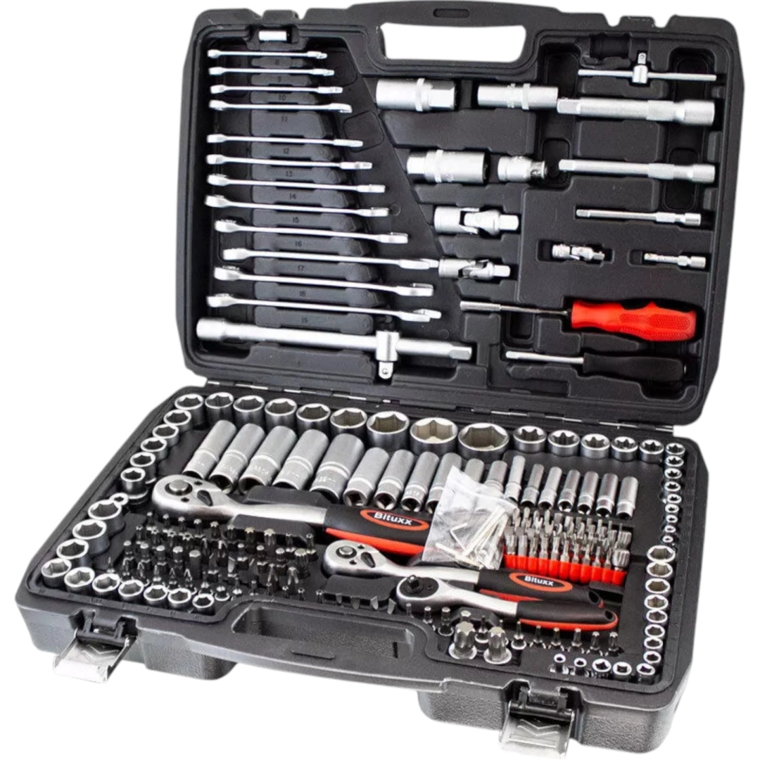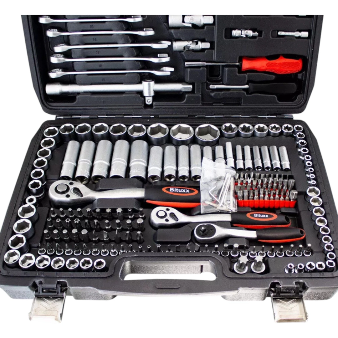 Táto univerzálna sada nástrčných kľúčov s 215 prvkami pokryje väčšinu prác na aute, okolo domu aj v profesionálnej dielni. Kvalitná chróm-vanádiová oceľ (CrV) zabezpečuje vysokú pevnosť, odolnosť proti korózii a dlhú životnosť aj pri intenzívnom používaní. Presné rozmery hlavíc a bitov umožňujú bezpečné a efektívne uťahovanie aj povoľovanie spojov.