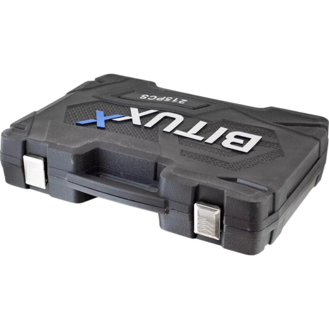 Kompletná sada náradia s 215 dielmi pre dielňu aj domácnosť. Obsahuje nástrčné hlavice, ráčňe, bity, imbusy, kľúče a predlžovacie nadstavce. Vyrobené z chróm-vanádiovej ocele (CrV) pre vysokú odolnosť a dlhú životnosť. Všetko prehľadne uložené v pevnom prenosnom kufri.