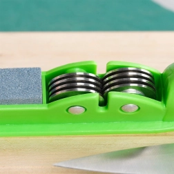 Kovové brúsne kotúčiky obnovia ostrie, predná kameninová plocha ho vyhladí pre čistý rez bez trhania.