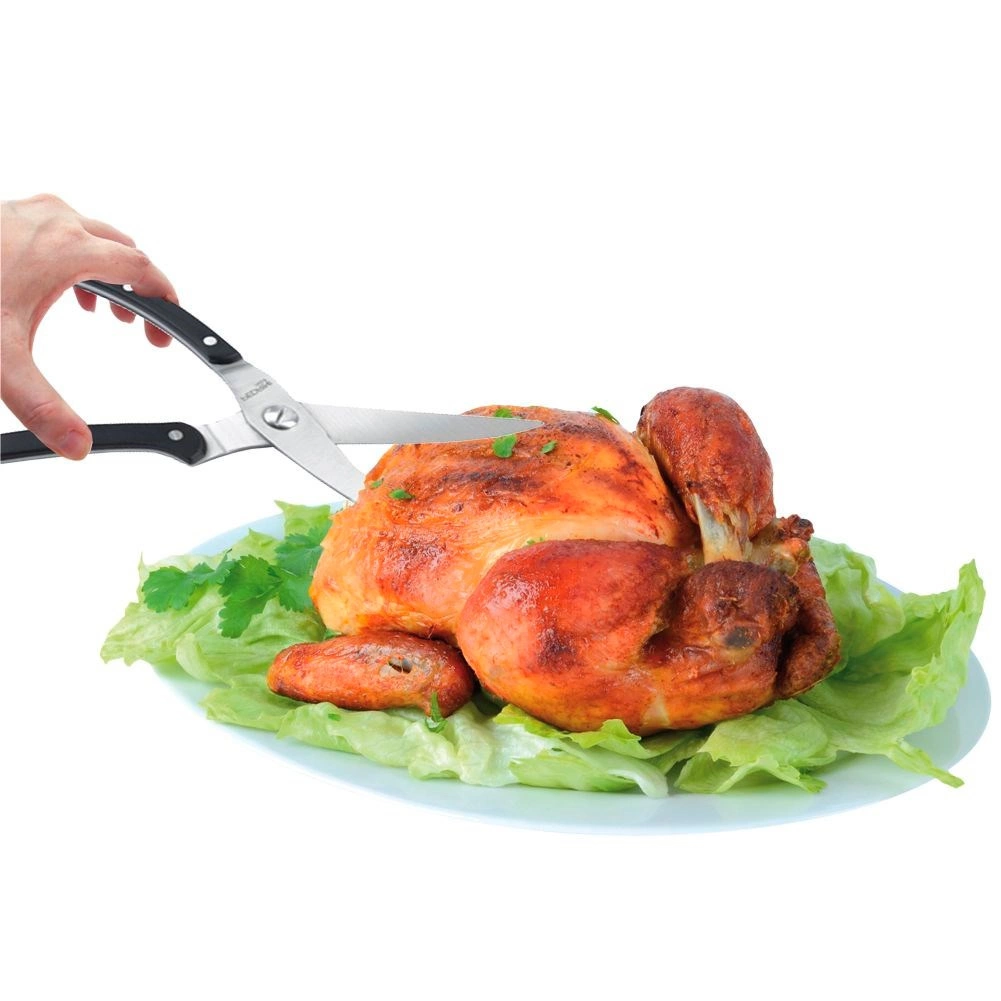 Praktické nožnice na hydinu sú navrhnuté na pohodlné porciovanie kurčaťa, kačky či morky – surovej, pečenej aj grilovanej. Ostré nehrdzavejúce čepele si poradia s kožou aj tenšími kosťami, zatiaľ čo ergonomické rukoväte z odolného plastu zabezpečujú istý úchop a dobrú páku.