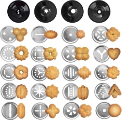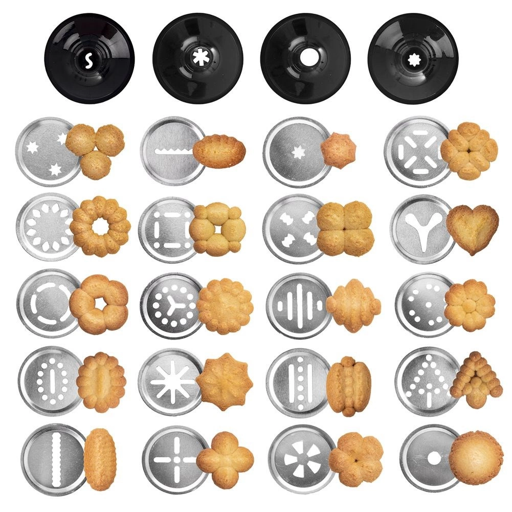 Z jednej sady vytvoríte desiatky rôznych štýlov sušienok – hviezdy, kvety, prúžky či srdcia. Stačí vymeniť disk a lisovať.
