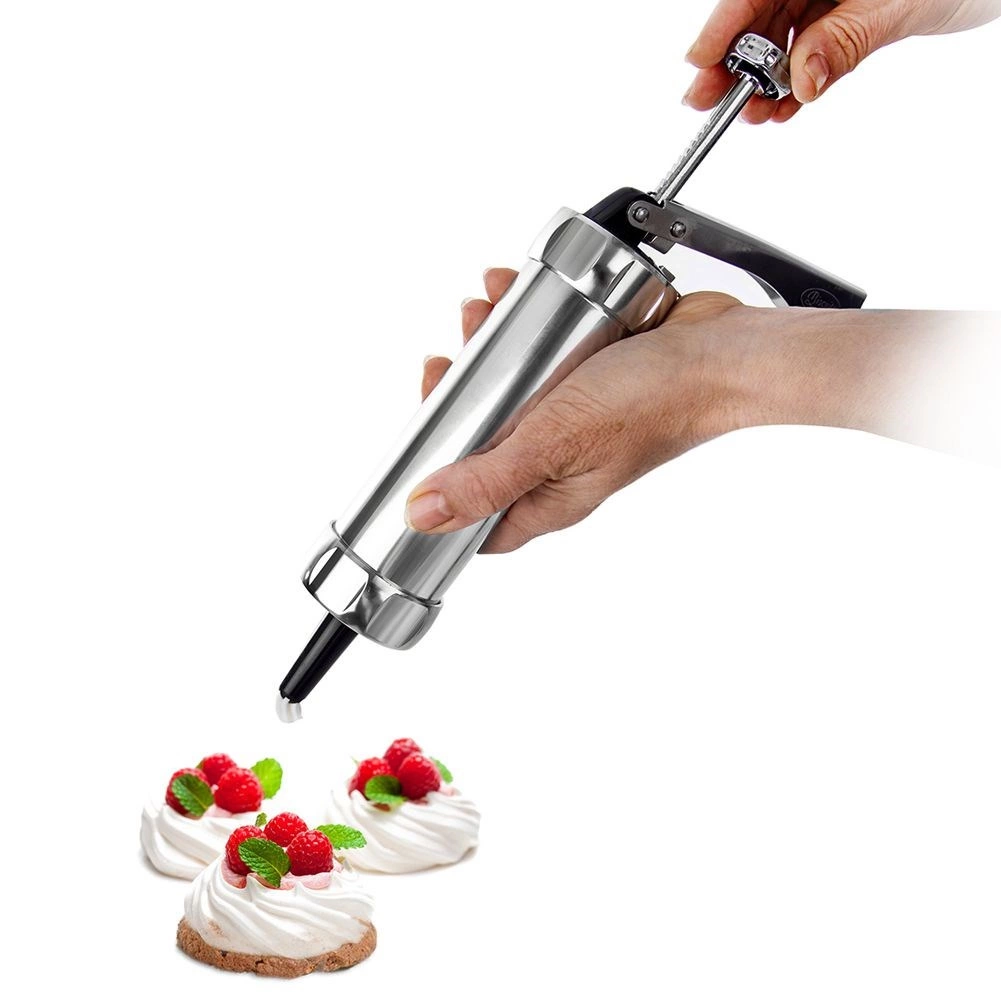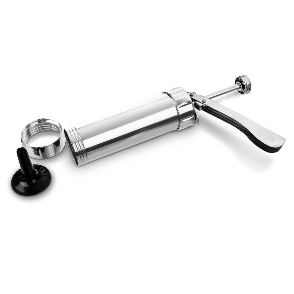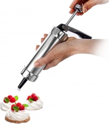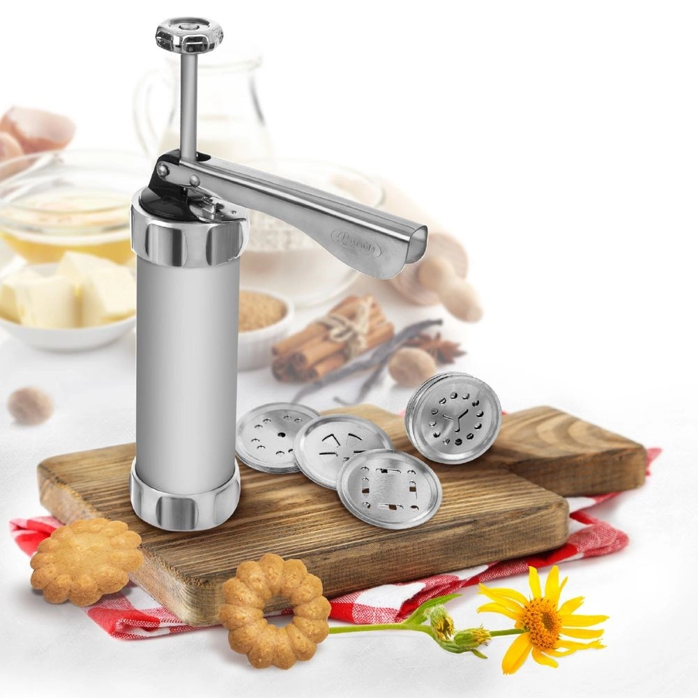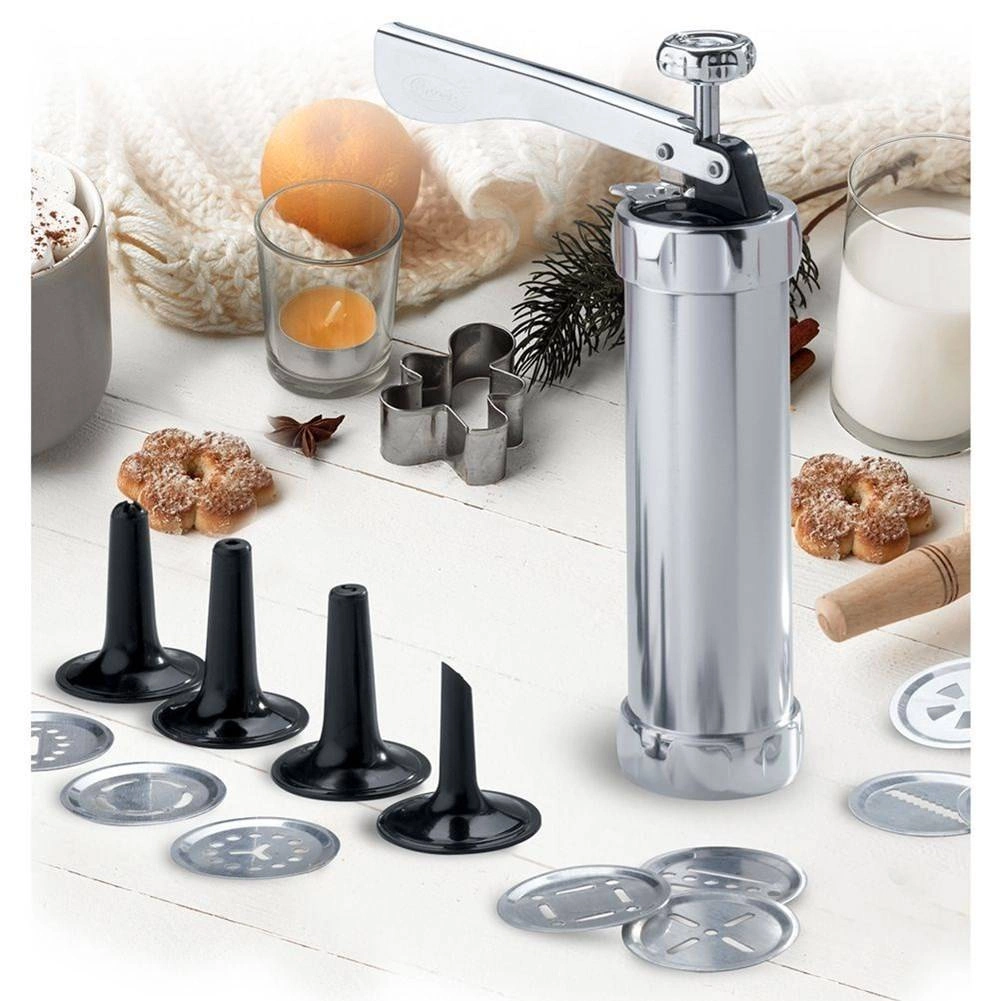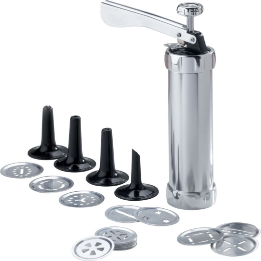 Táto 25-dielna sada kombinuje lis na sušienky a zdobiacu pištoľ v jednom nástroji, takže ľahko zvládnete tvarovanie cesta, zdobenie krémom aj plnenie šišiek. Kovové telo vyniká dlhou životnosťou a stabilitou pri práci, zatiaľ čo ergonomická páka s piestom umožňuje presné a opakovateľné dávkovanie.
