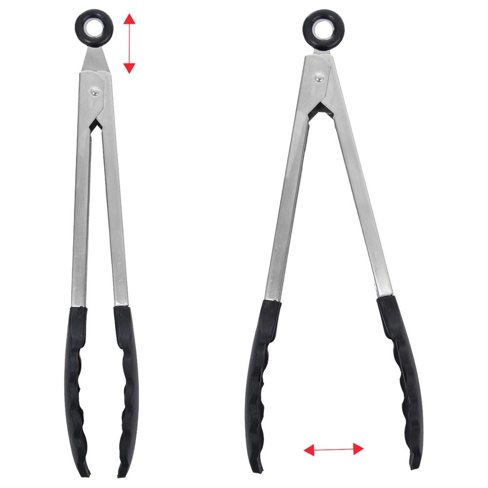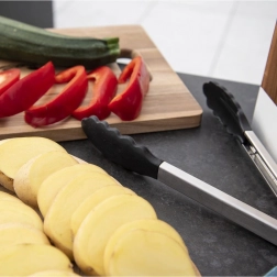 Praktické kuchynské kliešte s dĺžkou 27 cm z nehrdzavejúcej ocele s čiernymi silikónovými koncami pre šetrné a isté uchopenie. Ideálne na varenie aj grilovanie, s tepelne odolným silikónom do 220 °C, bezpečné pre nepriľnavé povrchy a s uzamykacou poistkou na úsporu miesta.