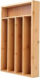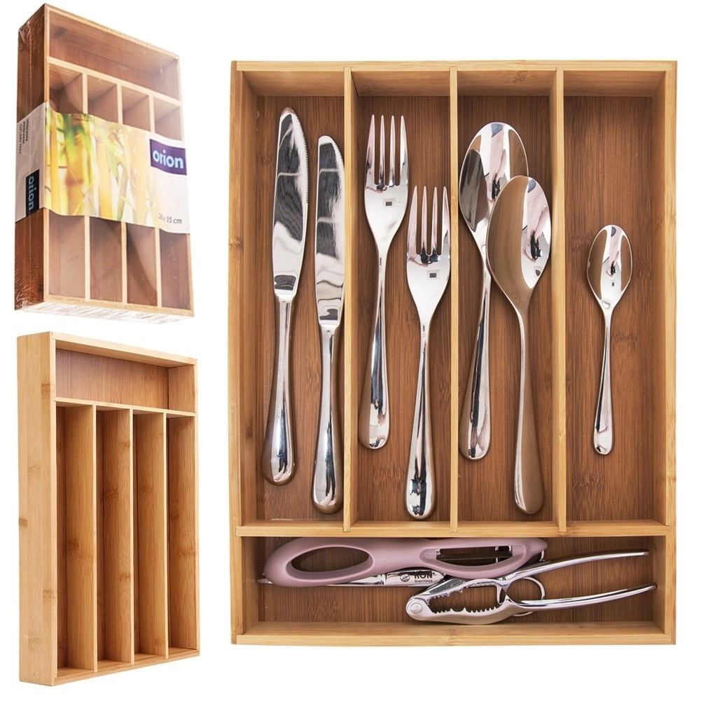 Praktický bambusový organizér do zásuvky s rozmermi 35 × 26 × 5 cm zaistí, že vaše príbory aj kuchynské náradie budú vždy prehľadne uložené. Vyrobený z prírodného bambusu, ktorý je odolný a odolný voči vlhkosti, ponúka päť prehľadných priehradiek na vidličky, nože, lyžice a drobné kuchynské nástroje. Univerzálna veľkosť pasuje do väčšiny zásuviek a ľahké čistenie zabezpečí bezproblémovú údržbu.